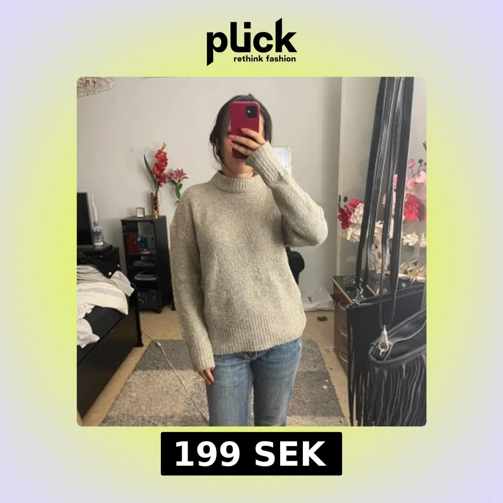 Mysig beige stickad tröja med hög krage och långa ärmar. Tröjan har en relaxed passform och breda ribbade muddar vid ärmslut och nederkant. Super mysig att slänga på sig när det är kyligt ute.