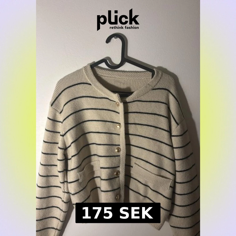 Snygg beige kofta med svarta ränder och guldiga knappar framtill. Modellen är croppad med två fickor och har en rund halsringning. Stickad i mjukt material, perfekt för lager-på-lager. Passar dig som gillar klassisk men chill stil. Passar både XS och S
