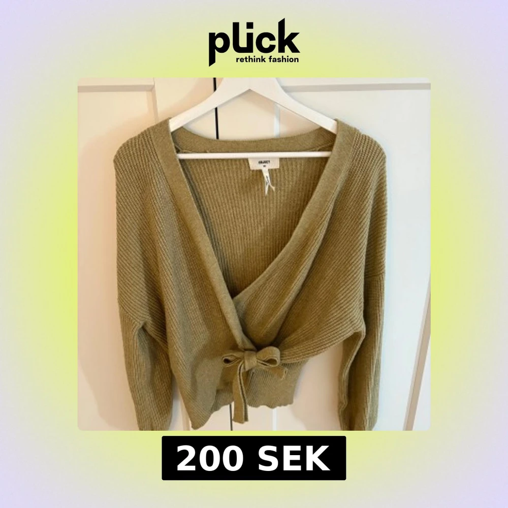 Säljer en olivgrön ribbstickad omlottkofta från Object i storlek XS. Koftan har lång ärm, djup v-ringning och knytband i midjan för en snygg passform. Perfekt att slänga på sig över ett linne eller t-shirt för en chill look.