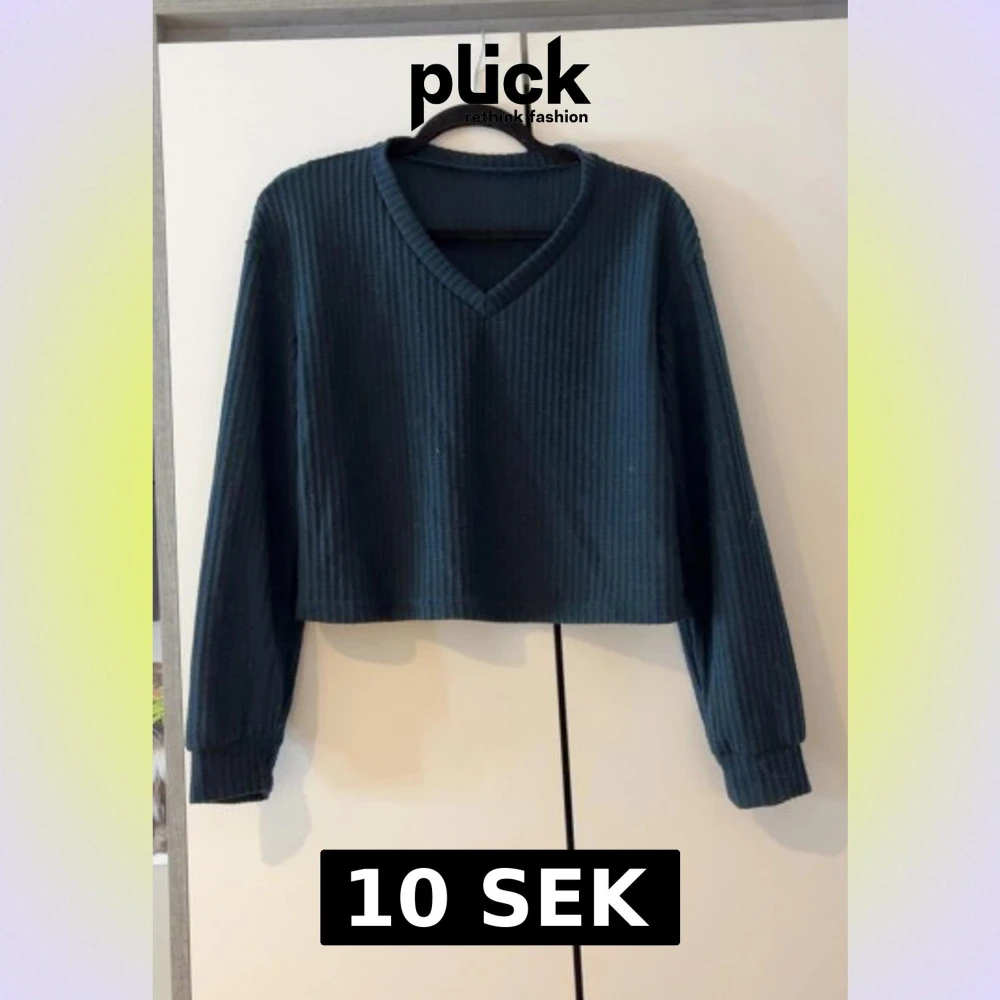 Säljer en mörkblå croppad tröja i ribbad stickad kvalitet. Tröjan har v-ringad hals och långa ärmar med muddar. Perfekt för dig som gillar en chill och trendig look. Passar dig som vill ha en lite kortare modell.