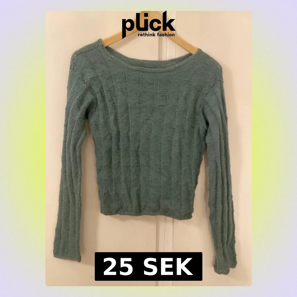 Säljer en grå stickad tröja med lång ärm och rutigt mönster. Tröjan har en rundad halsringning och är lite kortare i modellen. Perfekt för dig som gillar en enkel men snygg look med lite struktur i materialet.