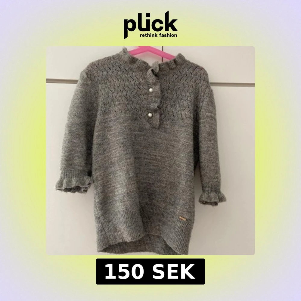 Superfin grå stickad tröja från Holly & Whyte med glittriga inslag, volangkant vid hals och ärmslut samt pärlknappar framtill. Mjuk och mysig med trekvartsärm och diskret mönster. Tröjan är använd ett par fåtal gånger.