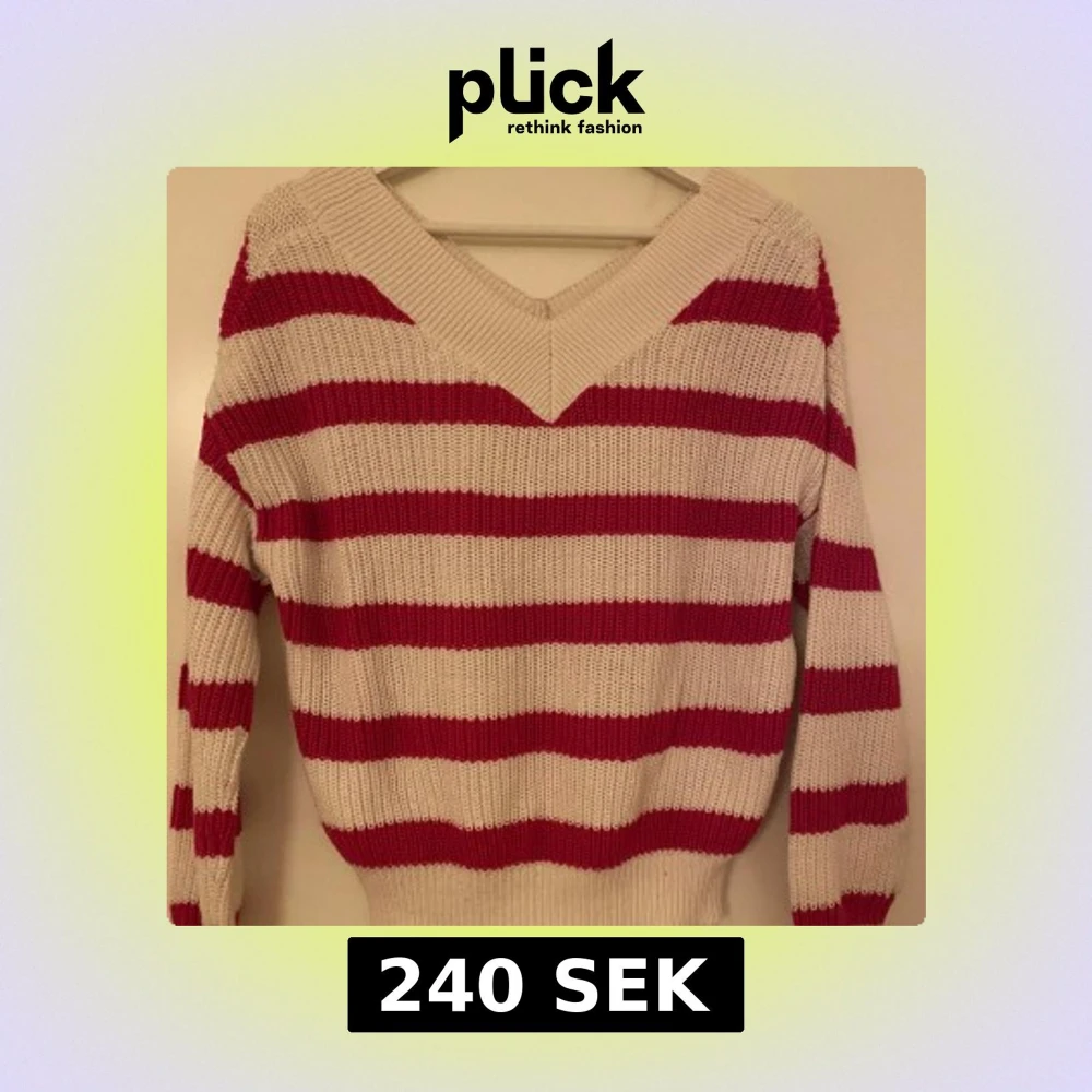 Säljer en stickad tröja med breda röda och vita ränder. Tröjan har en djup v-ringning och ribbade muddar vid ärmslut och midja. Jättefin på sommaren till en kjol