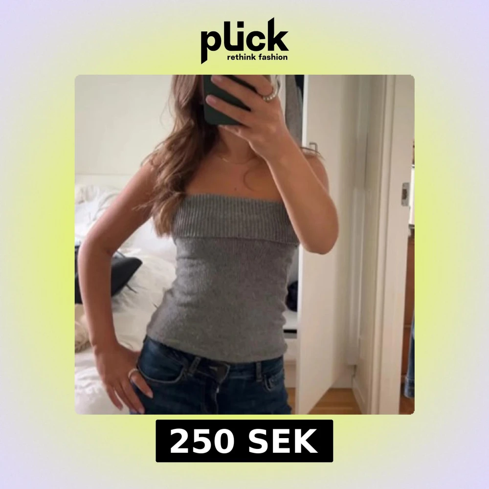 Säljer en grå stickad tubtopp med ribbad kant upptill. Toppen är bandeau-modell och sitter tight mot kroppen, perfekt för dig som gillar en enkel och clean look. Materialet är mjukt och stretchigt stickat tyg som ger en skön passform. Egensydd