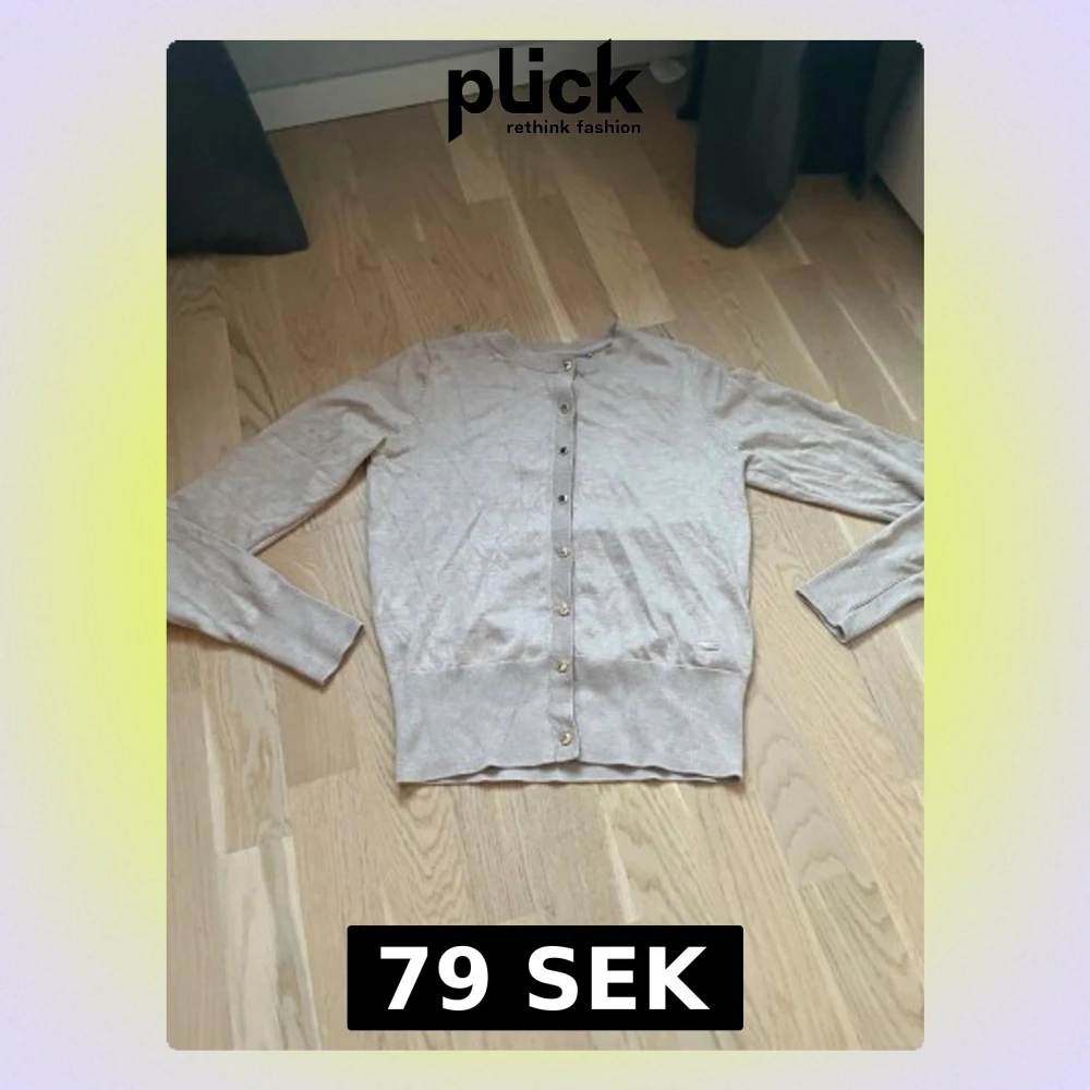 Snygg beige kofta från Holly & Whyte i storlek XS. Den har rund hals, långa ärmar och guldfärgade knappar framtill. Materialet är mjukt och stickat, perfekt för lager på lager. Diskret metallmärke vid nederkanten ger en extra touch.