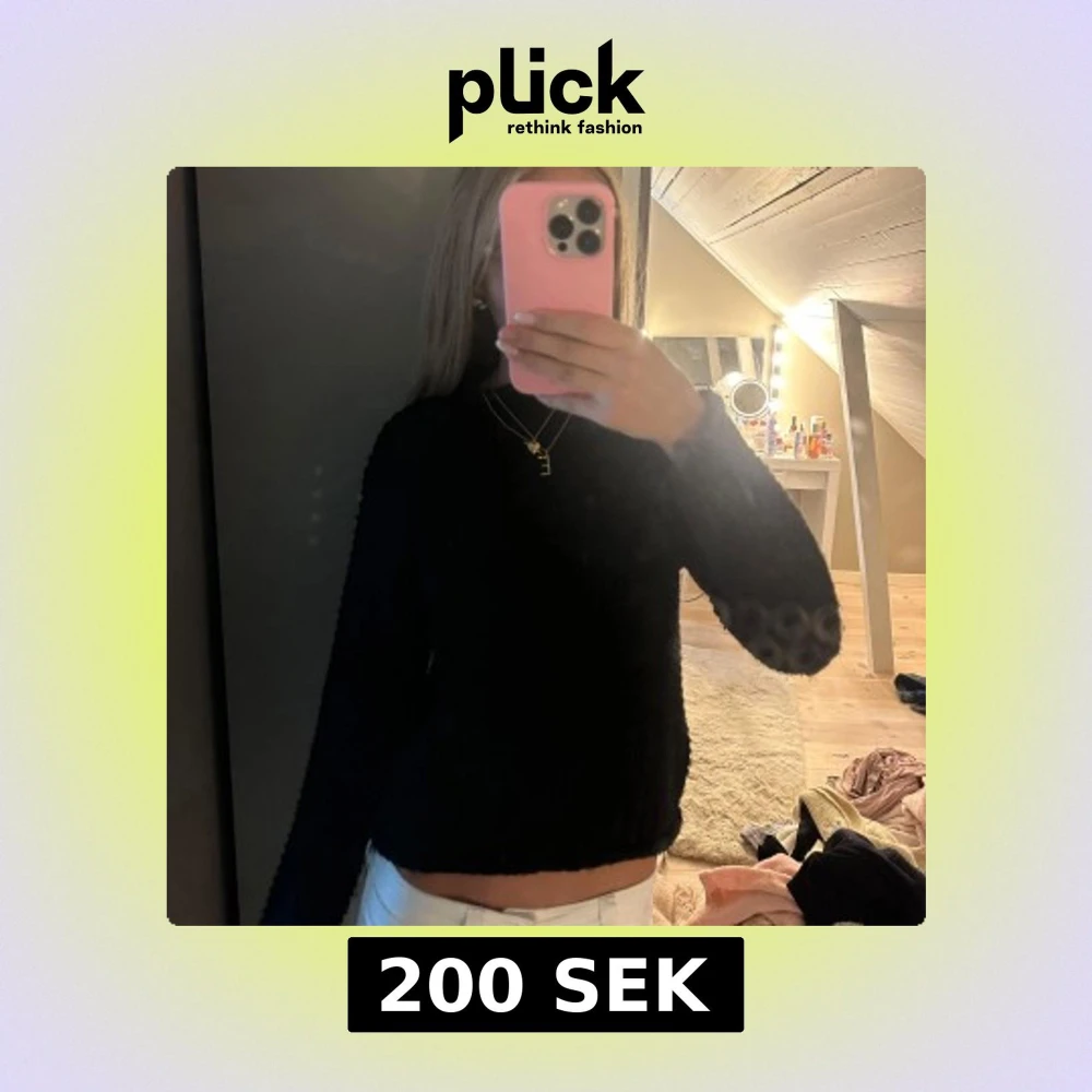Säljer en svart stickad polotröja med grov struktur. Tröjan har lång ärm och en hög krage som ger en chill och stilren vibe. Perfekt att matcha med jeans eller kjol för en enkel men snygg look. Materialet är mjukt och värmande, passar dig som gillar klassiska färger.