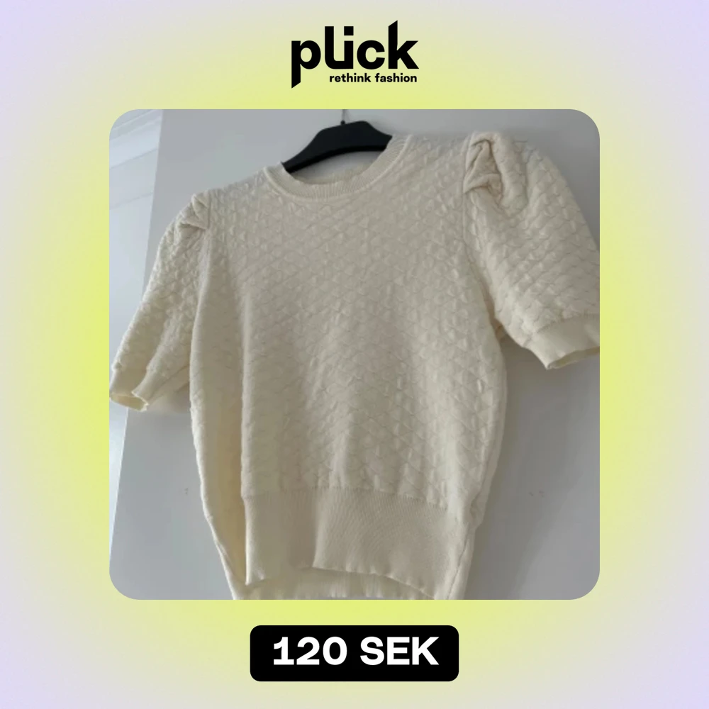 Säljer en superfin krämfärgad stickad tröja från SHEIN. Den har ett diskret mönster och puffiga korta ärmar som ger en söt touch. Perfekt för både vår och höst! 🧡