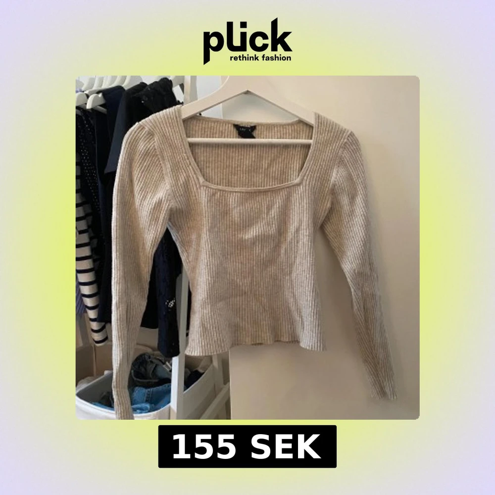 Superfin beige ribbad tröja från Lindex med fyrkantig urringning och långa ärmar. Sitter snyggt och har en lite tightare passform som framhäver figuren. Perfekt att styla med jeans eller kjol för en clean look.