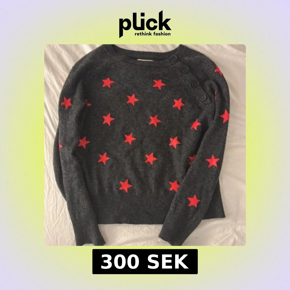 Mörkgrå stickad tröja från Zadig & Voltaire med röda stjärnor över hela tröjan. Rund halsringning och dekorativa knappar på ena axeln. Långärmad och i mjukt material som passar perfekt till höst och vinter.