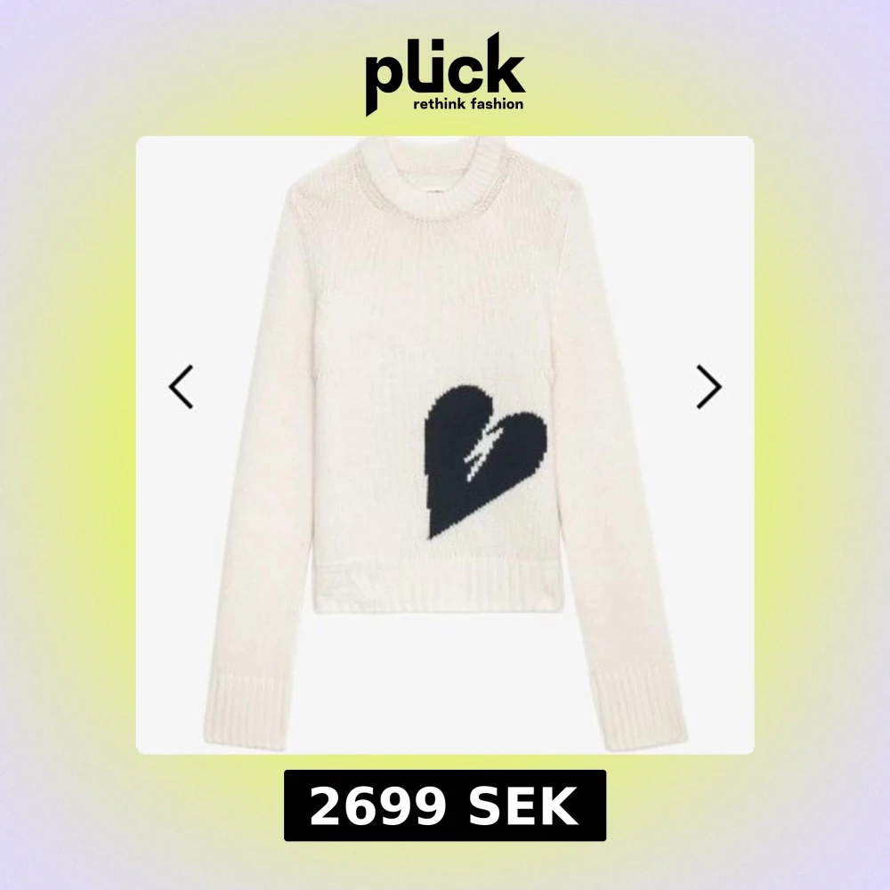 Vit stickad tröja med lång ärm och ribbade muddar. På framsidan finns ett stort svart hjärta med blixtdetalj, vilket ger en edgy vibe. Tröjan har rund hals och är perfekt för dig som gillar grafiska motiv och vill ha en mysig men cool look.