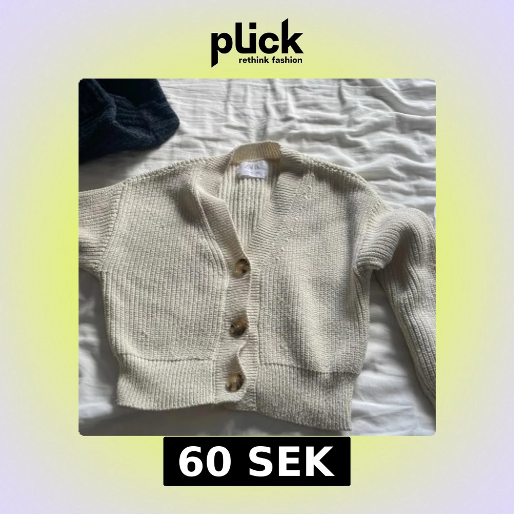 Säljer en beige stickad kofta från Zara med grov ribbstickning och tre stora knappar framtill. Koftan har v-ringad hals och långa ärmar, perfekt för lager på lager. Enkel och clean design som funkar till många olika stilar.