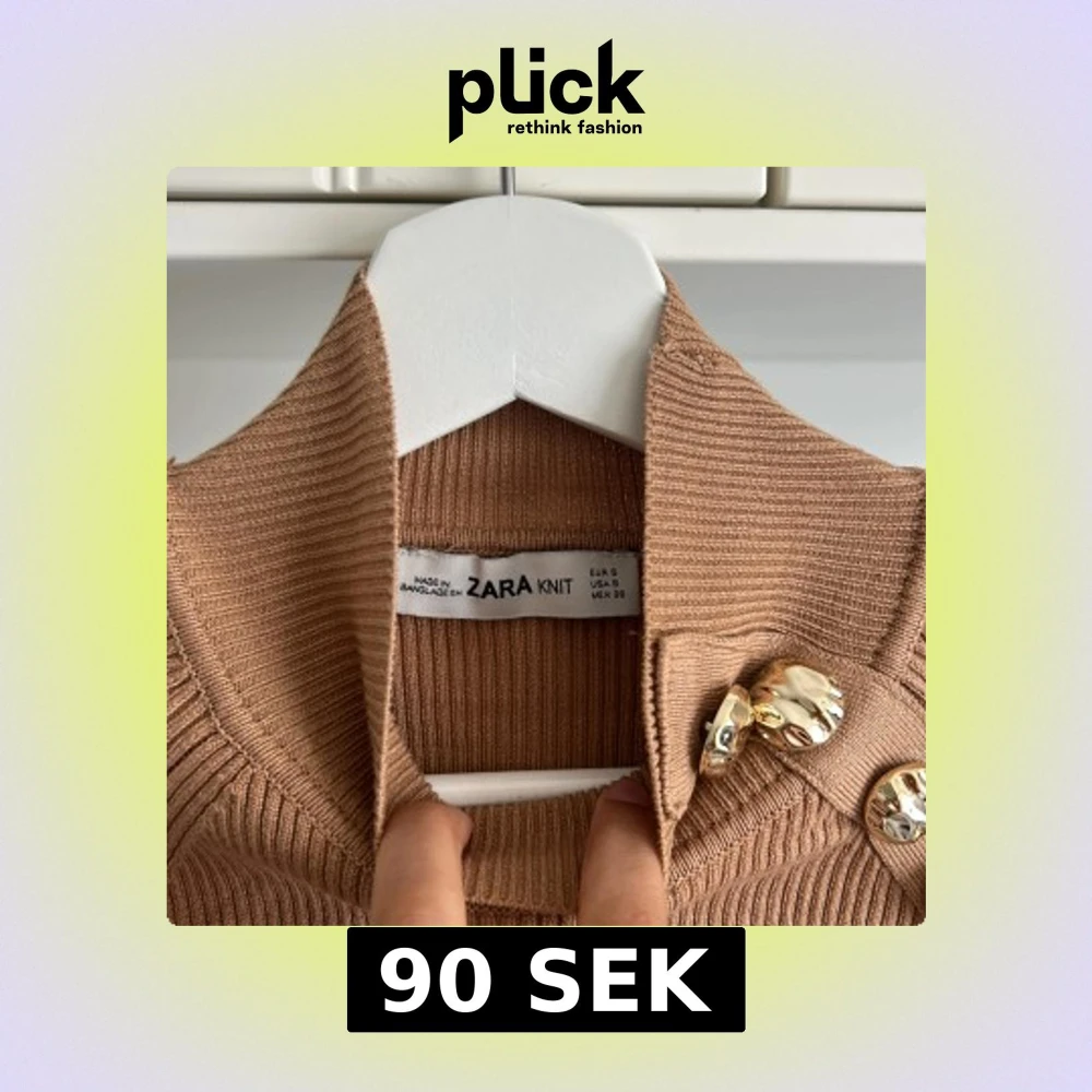 Säljer en beige ribbad stickad tröja från Zara med hög krage och dekorativa guldknappar längs axeln. Tröjan har lång ärm och en snygg, lite croppad passform. Perfekt för att lyfta din outfit med en elegant touch. Priset går att diskutera