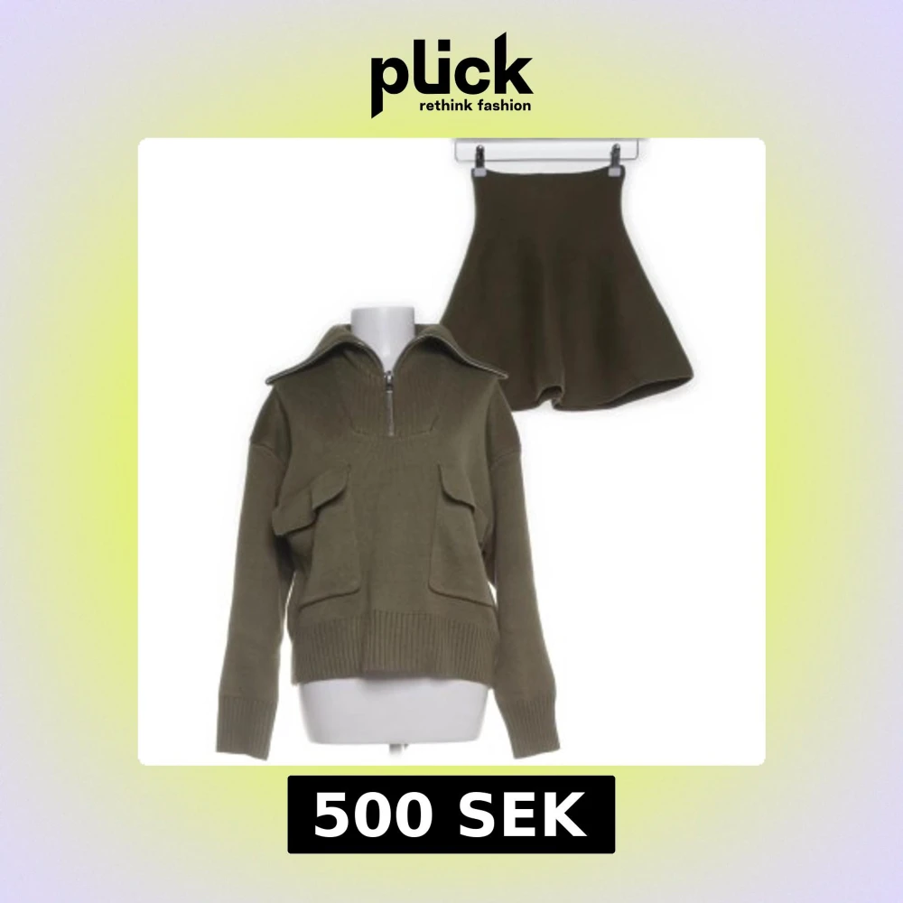 Säljer en olivgrön stickad tröja från Zara med halv dragkedja och stora fickor framtill som har en matchande kjol till
