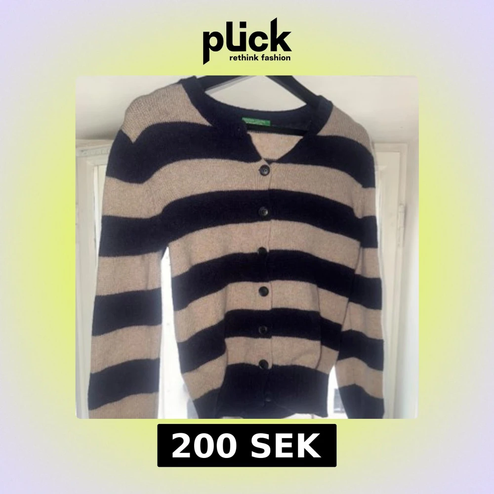 Beige och mörkblå randig kofta från United Colors of Benetton. Klassisk modell med rund hals, långa ärmar och svarta knappar framtill. Mjuk stickad känsla som passar perfekt till jeans eller kjol.