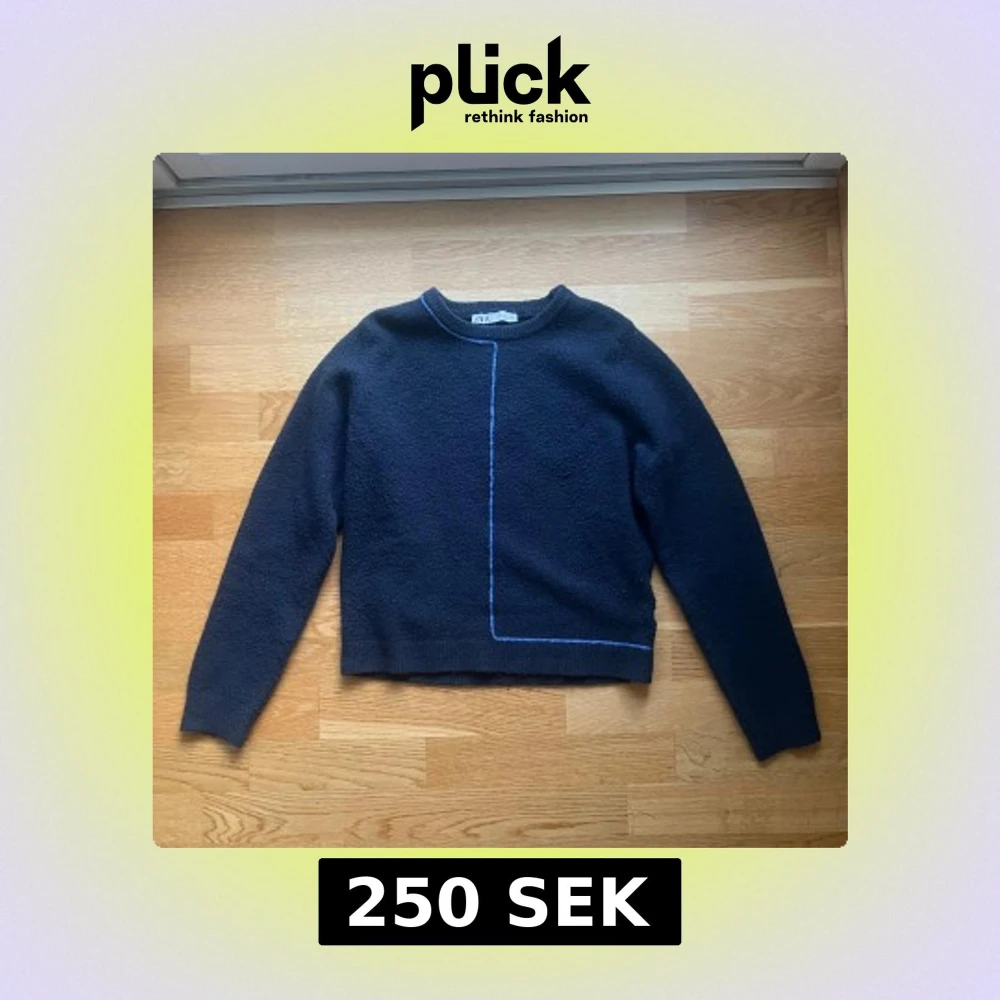 Mörkblå stickad tröja från Zara med lång ärm och rund hals. Tröjan har en unik blå linje som går vertikalt och horisontellt över framsidan och baksidan. Är i storlek L men känns mer som storlek S.