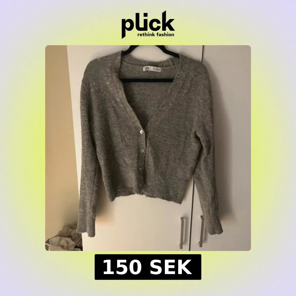 Mysig grå kofta från Zara med v-ringning och fyra knappar framtill. Koftan är stickad och har långa ärmar samt ribbade muddar vid ärmslut och nederkant. Perfekt för lager-på-lager och chill dagar.