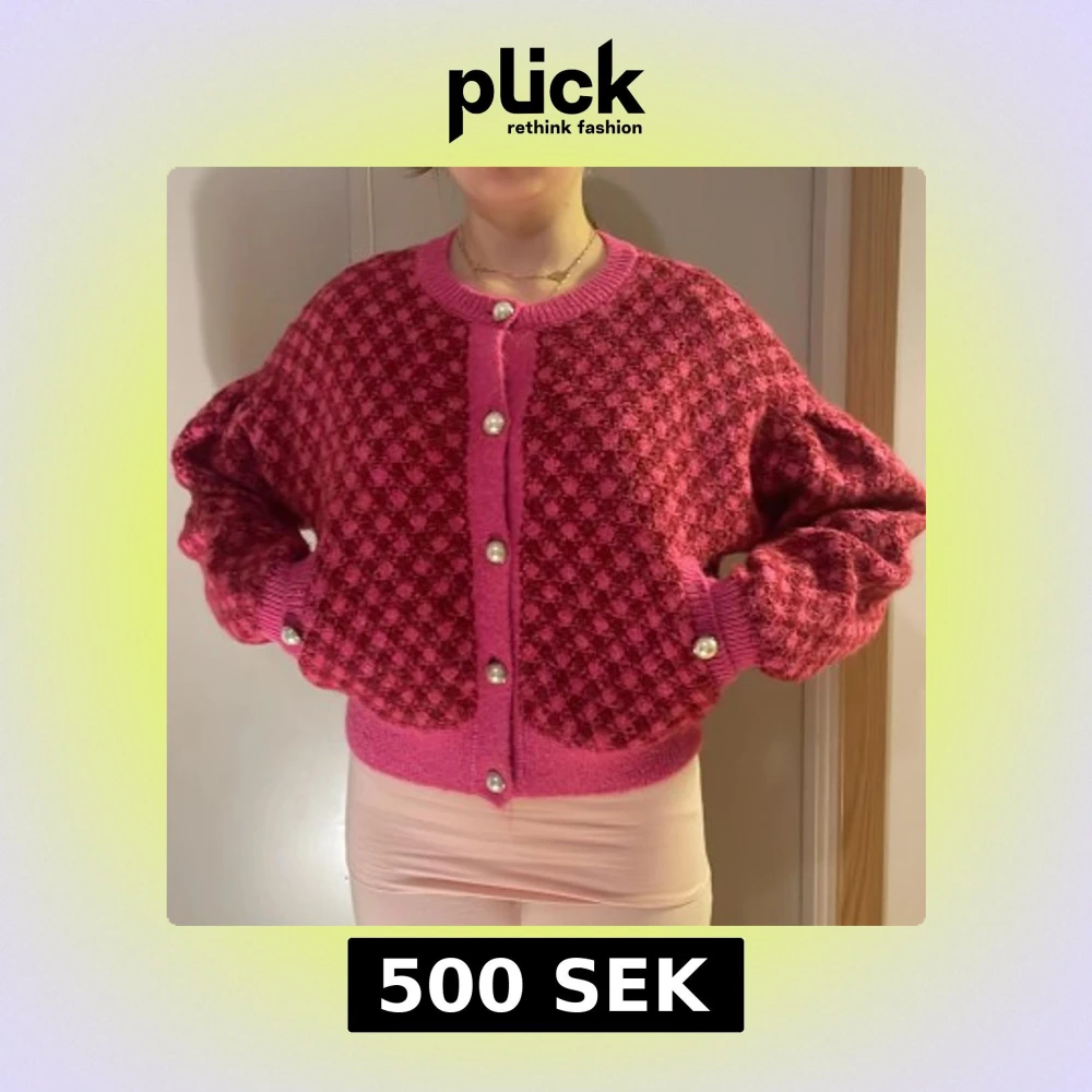 Superfin rosa kofta från Zara med coolt rutigt mönster och stora pärlknappar. Koftan är stickad, har lång ärm och breda muddar. Perfekt för dig som vill sticka ut med en färgglad och trendig look.