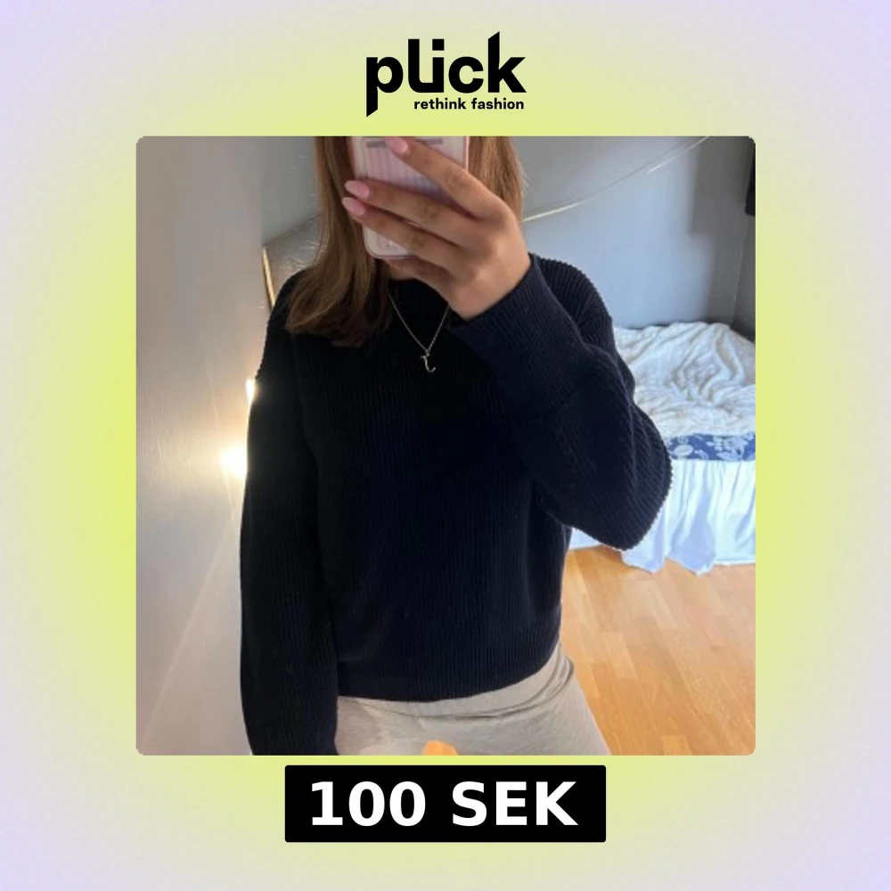 Säljer en stilren mörkblå stickad tröja med långa ärmar.