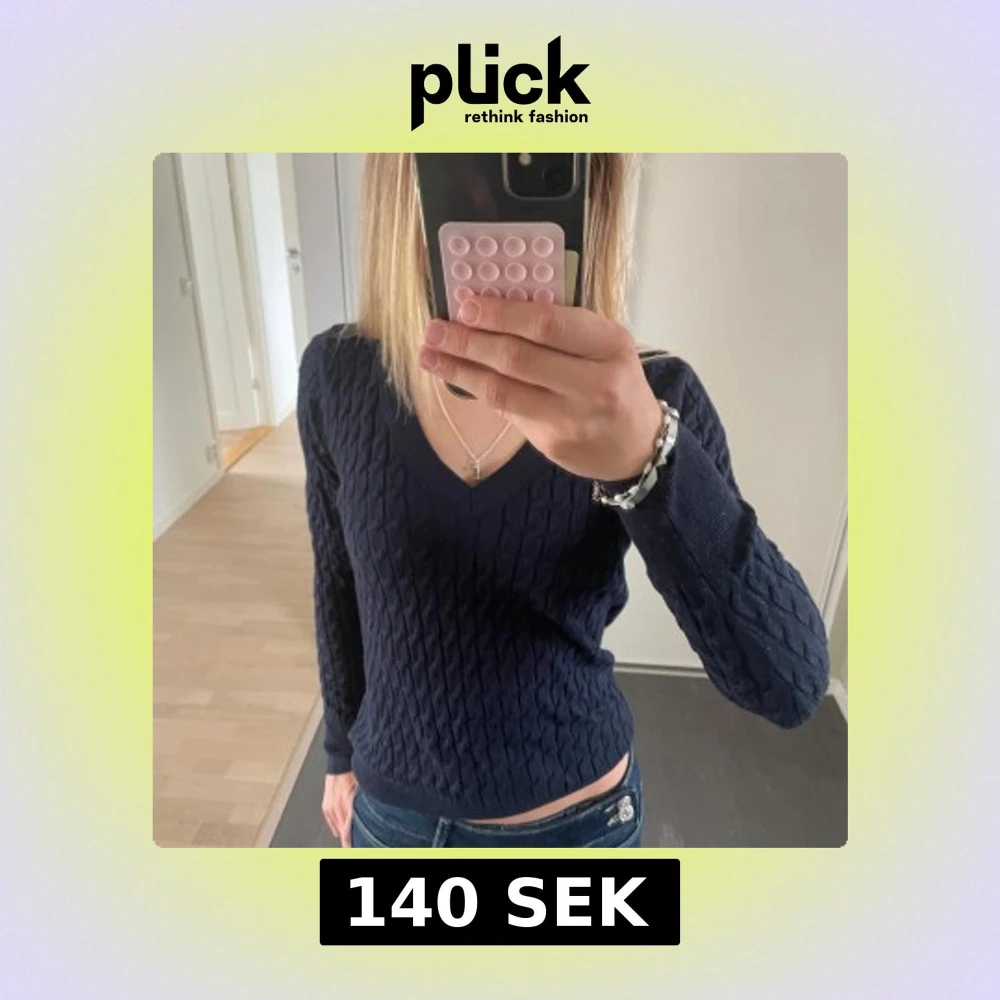 Snygg mörkblå stickad tröja från Zara med v-ringning och kabelstickat mönster. Långärmad och i mjuk bomullsblandning. Storlek M men passar jätte fint på mig som brukar ha XS-S på tröjor 🫶