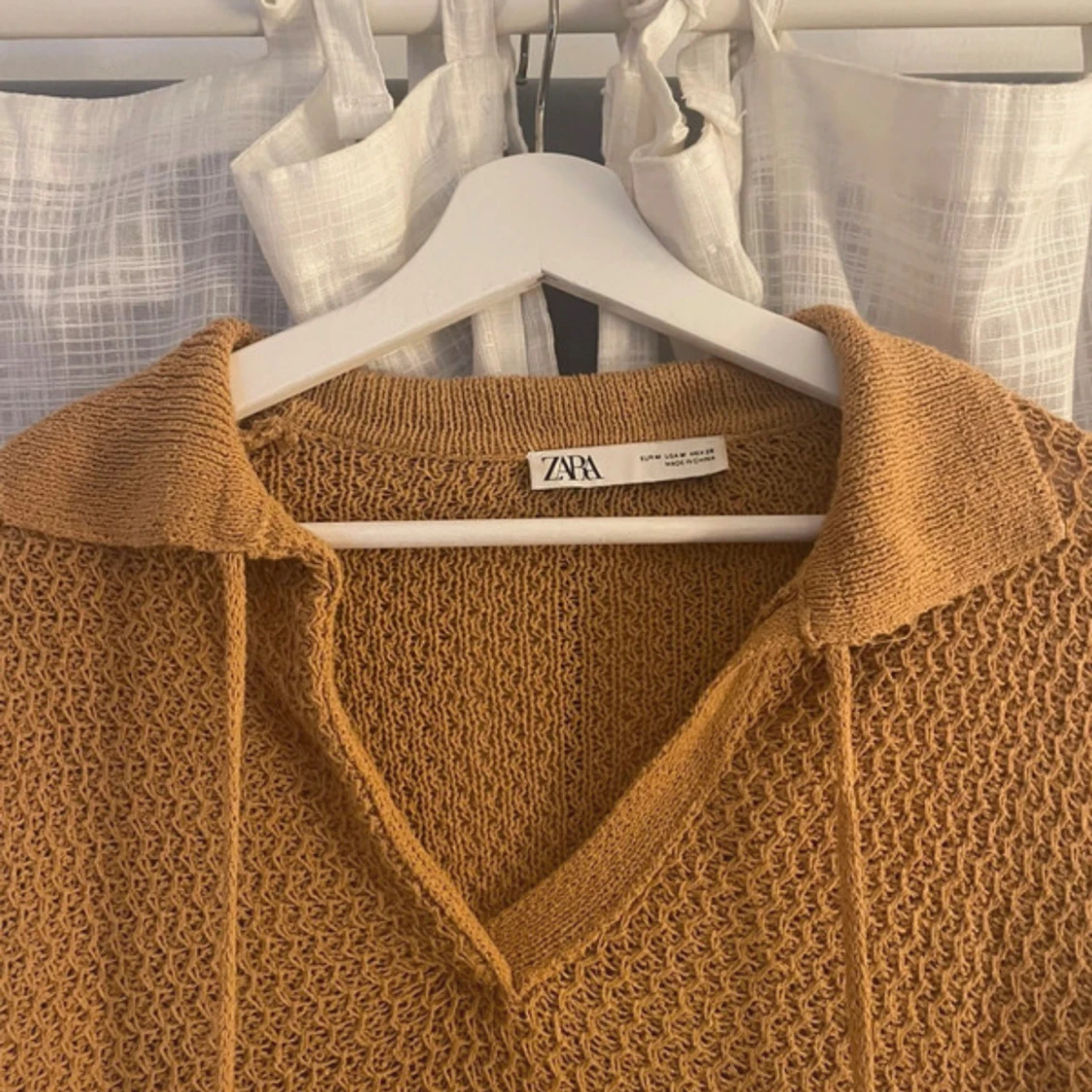 Säljer en stickad brun tröja från Zara med snygg krage och v-ringning. Tröjan har trekvartslånga ärmar, ribbade muddar och snörning med tofsar.🧡