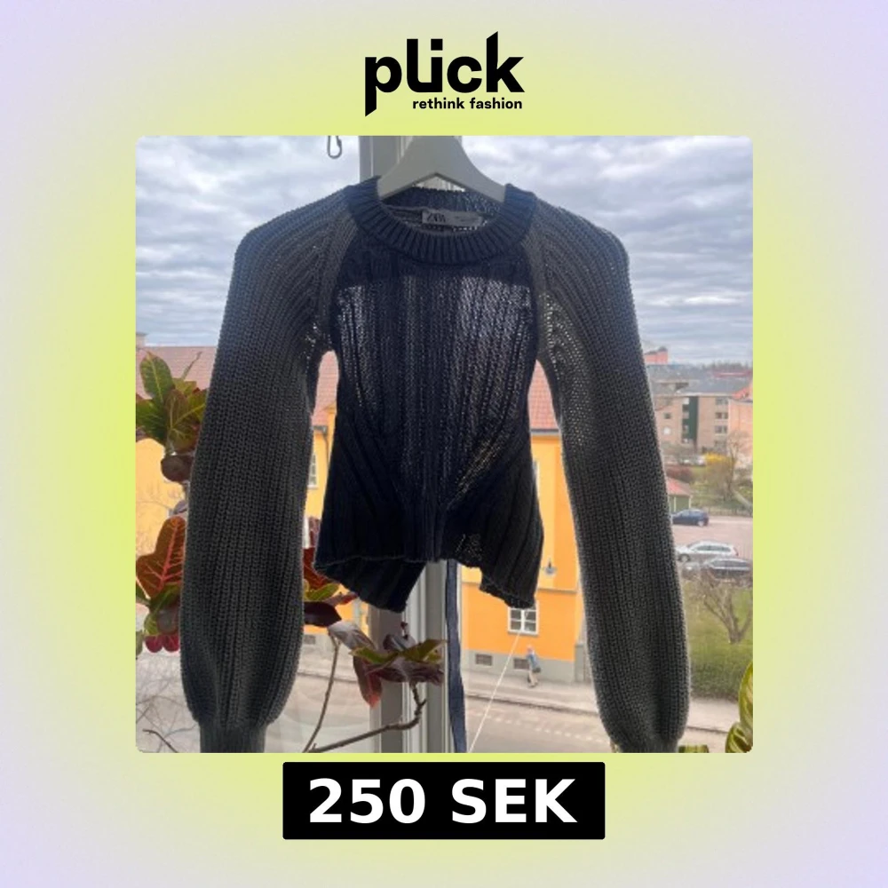 Säljer en mörkblå stickad tröja från Zara med unik design. Tröjan har långa ärmar och en öppen rygg med knytning.