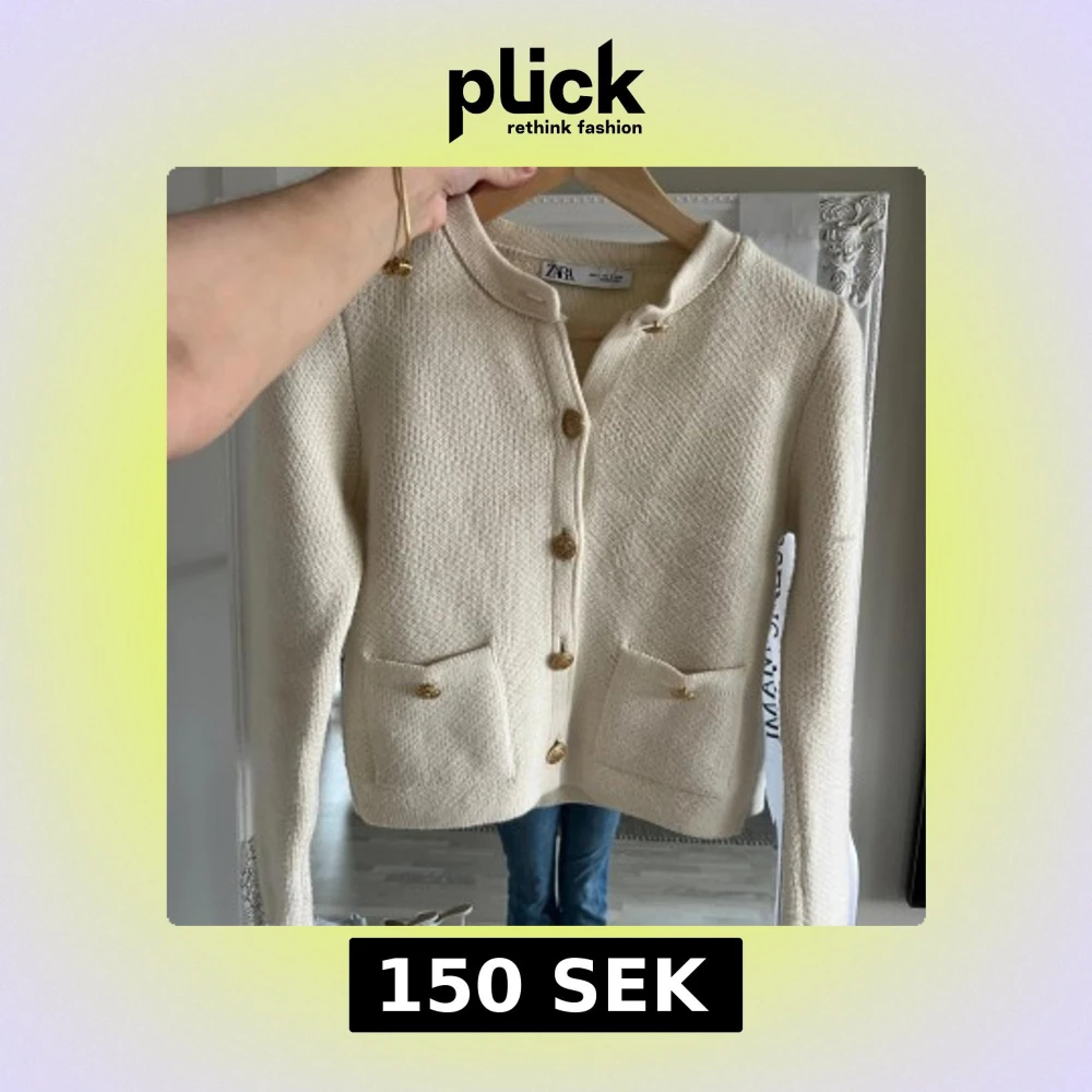 Superfin beige kofta från Zara med snygga guldknappar framtill och två fickor. Koftan är stickad, har rund halsringning och långa ärmar. Perfekt för lager-på-lager och ger en clean och stilren look.