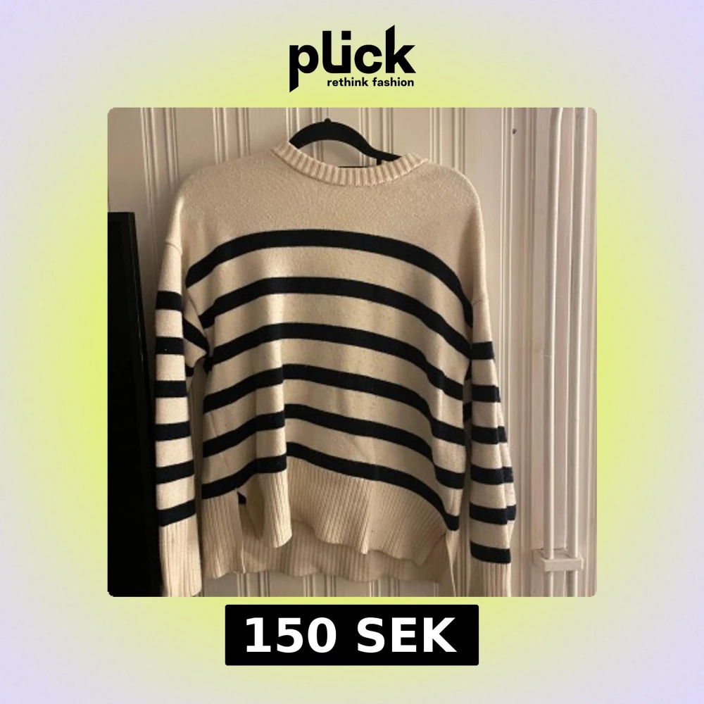 Säljer en stickad tröja med breda svarta ränder på beige botten. Tröjan har rund halsringning, ribbade muddar och lång ärm. Perfekt för dig som gillar klassisk och chill stil.