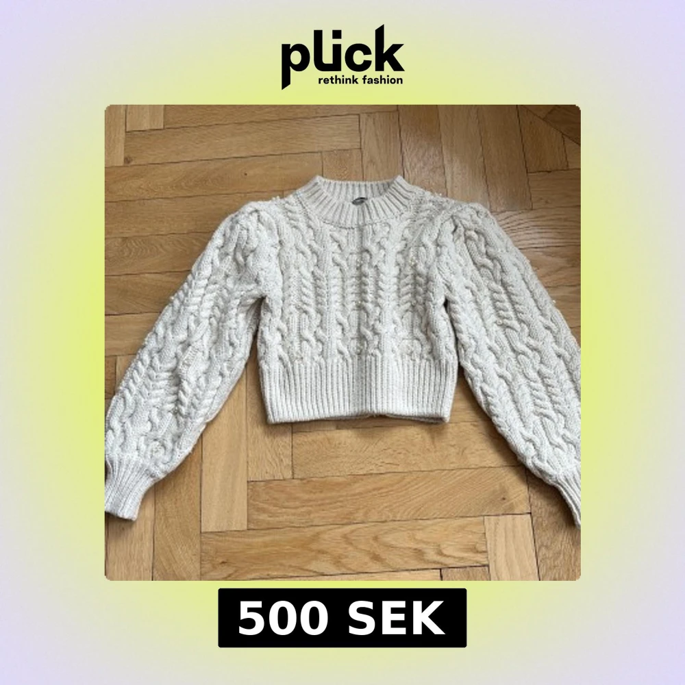 Säljer en snygg vit stickad tröja från Zara med flätstickat mönster och pärldetaljer. Tröjan är croppad och har långa ärmar med ribbade detalj🤍