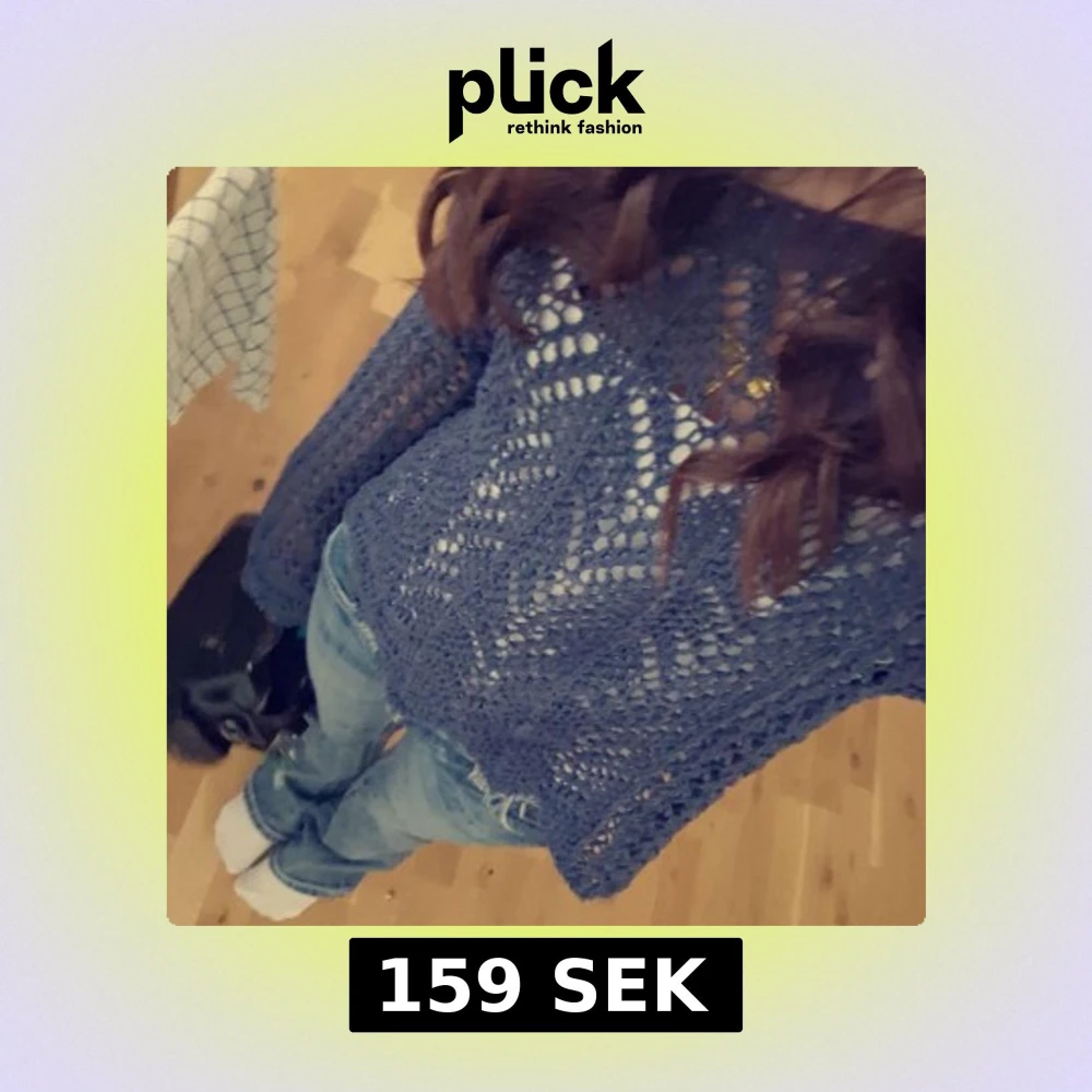 Säljer en blå stickad tröja med ett luftigt och öppet mönster. Tröjan har långa ärmar och en avslappnad passform, perfekt för lager-på-lager-stil. Passar bra till jeans för en casual look.