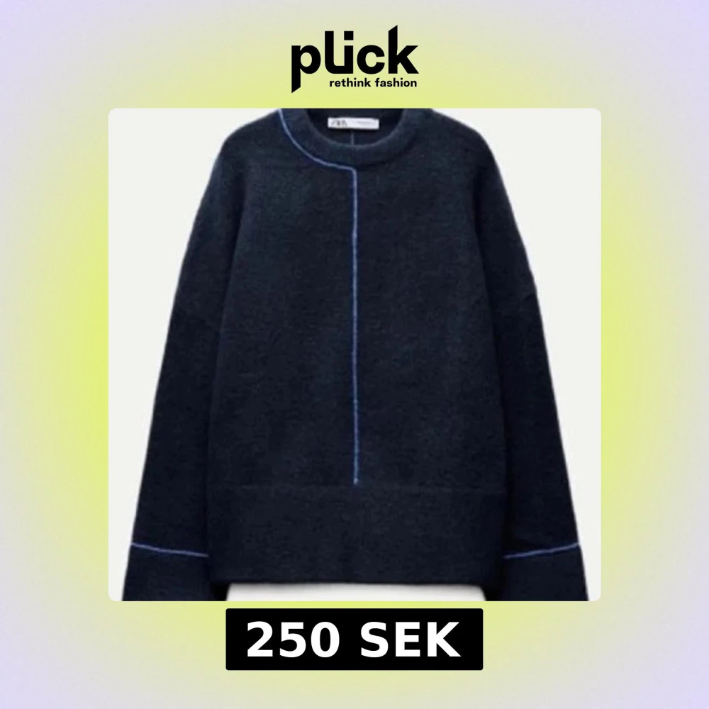 Snygg mörkblå stickad tröja från Zara med ljusblå sömmar framtill och vid ärmsluten. Tröjan har en loose passform och långa ärmar. Verkligen jätte mysig!