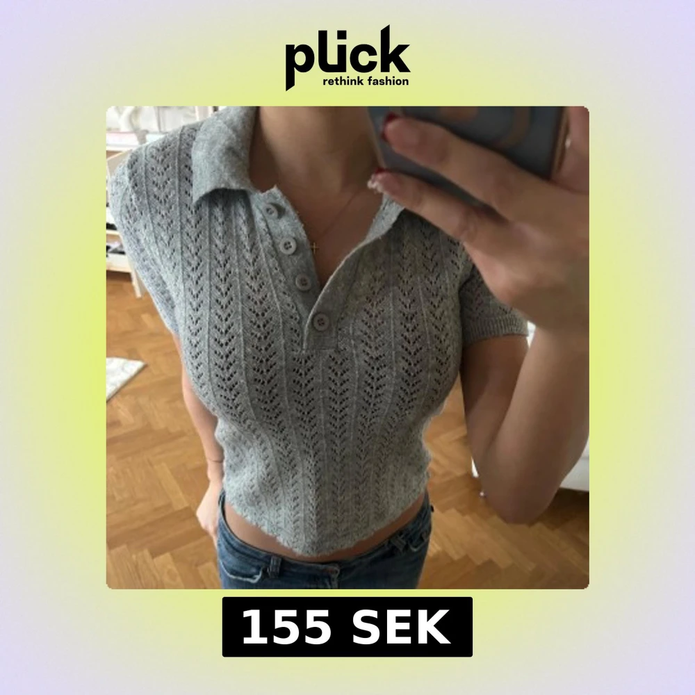 Säljer en grå stickad croppad pikétröja med krage och knappar framtill. Tröjan har korta ärmar och ett diskret hålmönster i tyget. Perfekt för dig som gillar en trendig och bekväm stil.
