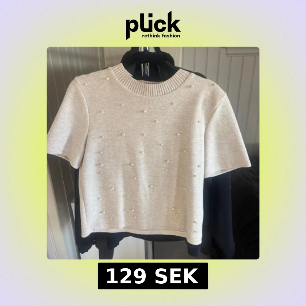 Snygg beige topp från Zara med korta ärmar och ribbad rund hals. Toppen är dekorerad med små pärlor över hela framsidan för en extra touch. Materialet är mjukt och stickat, perfekt för dig som gillar stilrena detaljer.