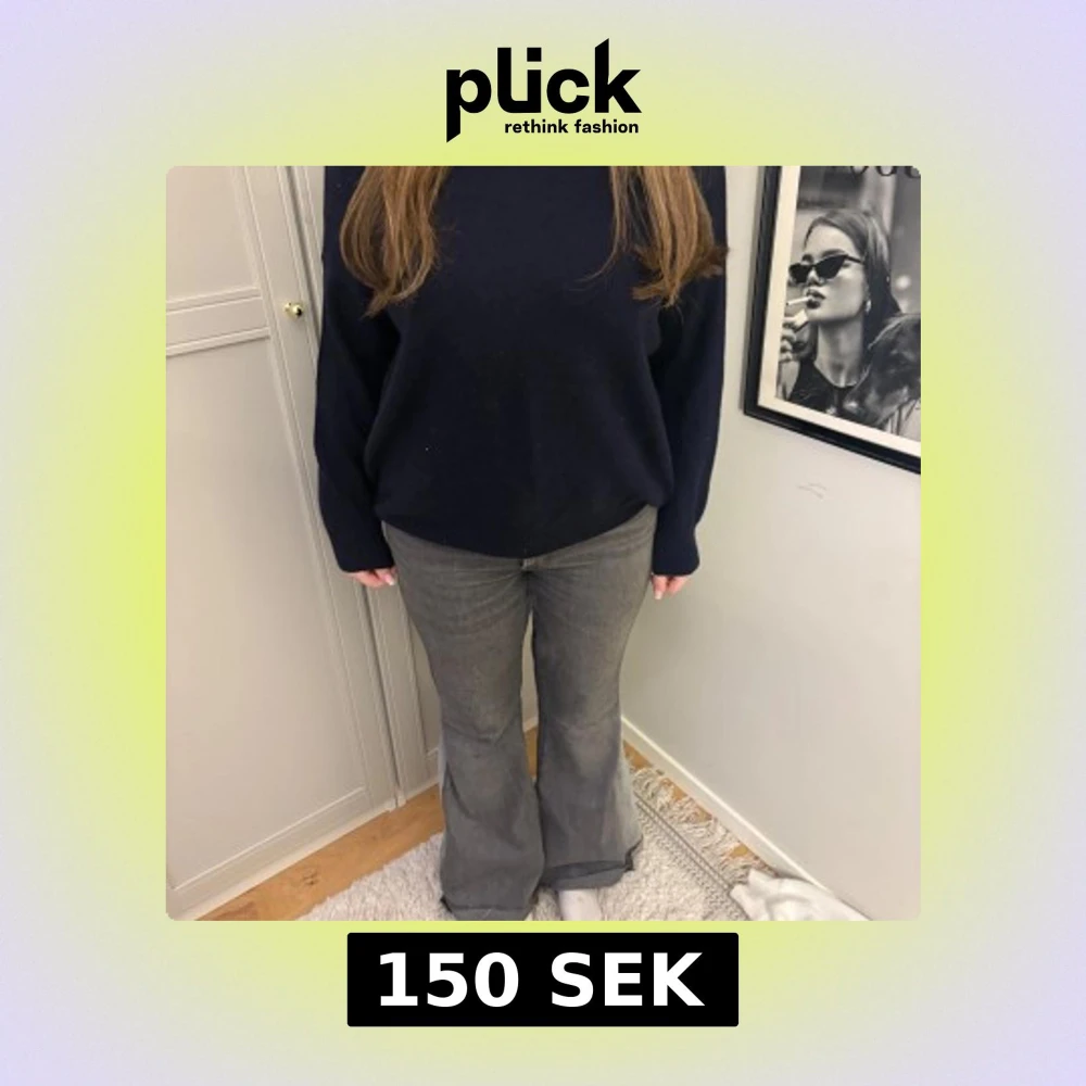 Säljer en mörkblå stickad tröja med lång ärm. Perfekt för kyligare dagar och enkel att matcha med olika outfits.
