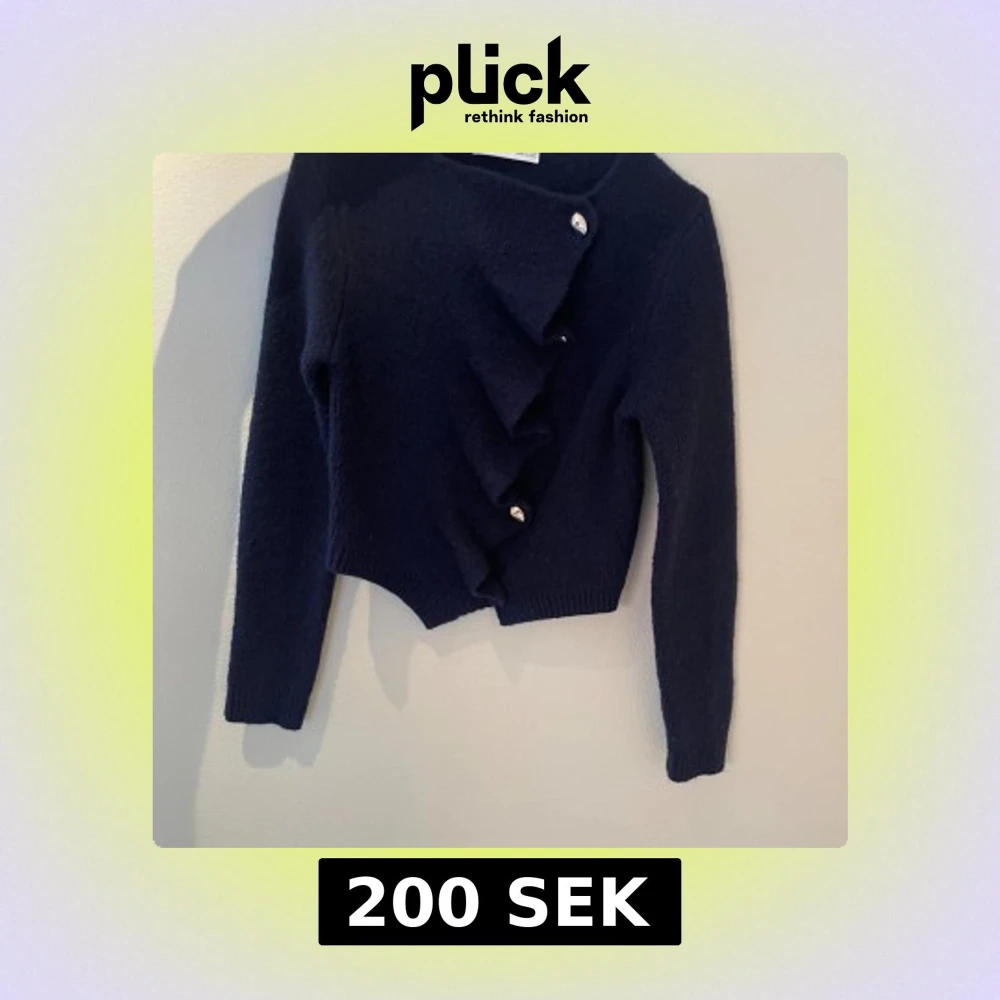 Mörkblå kofta från Zara med lång ärm och snygga silvriga knappar framtill. Koftan har en unik volangdetalj längs knäppningen och är stickad i ett mjukt material. Perfekt för dig som vill ha något extra till din outfit.