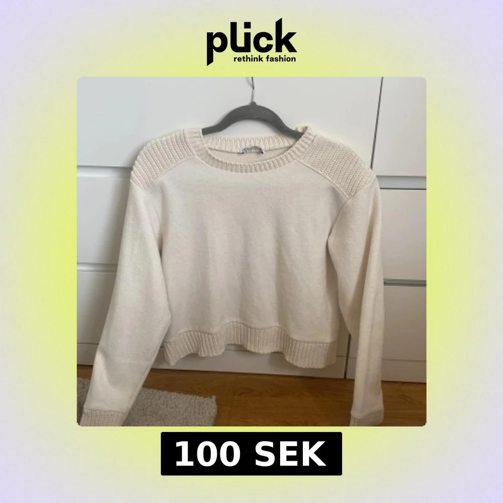 Superfin vit stickad tröja från Zara med ribbade detaljer vid hals, axlar, ärmslut och nederkant. Tröjan har en klassisk rund halsringning och lång ärm, perfekt för lager-på-lager och chill vibes.