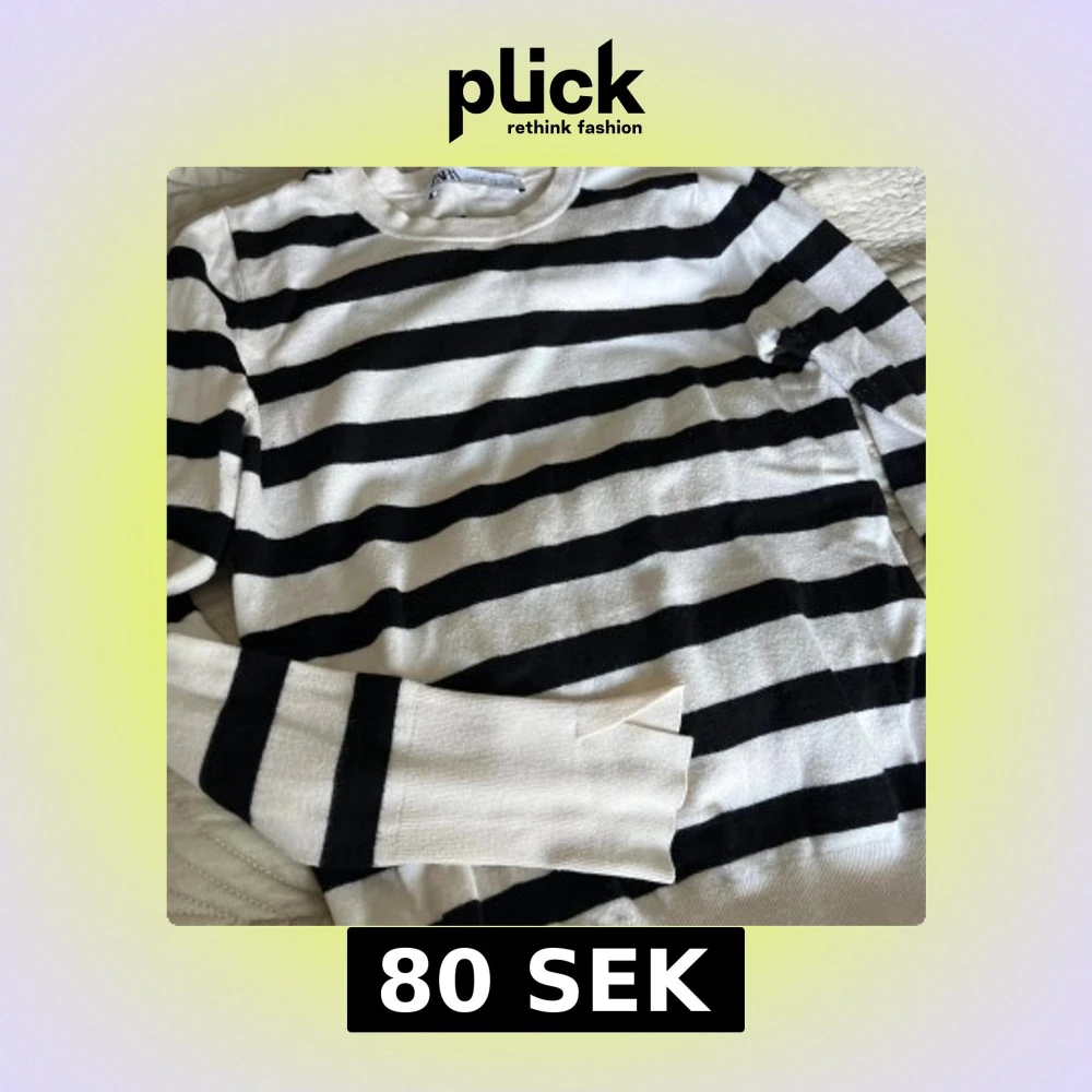 Snygg stickad tröja från Zara i svart och vitt med breda horisontella ränder. Tröjan har rund halsringning, långa ärmar och ribbade muddar. Perfekt för dig som gillar klassisk stil med en modern twist.