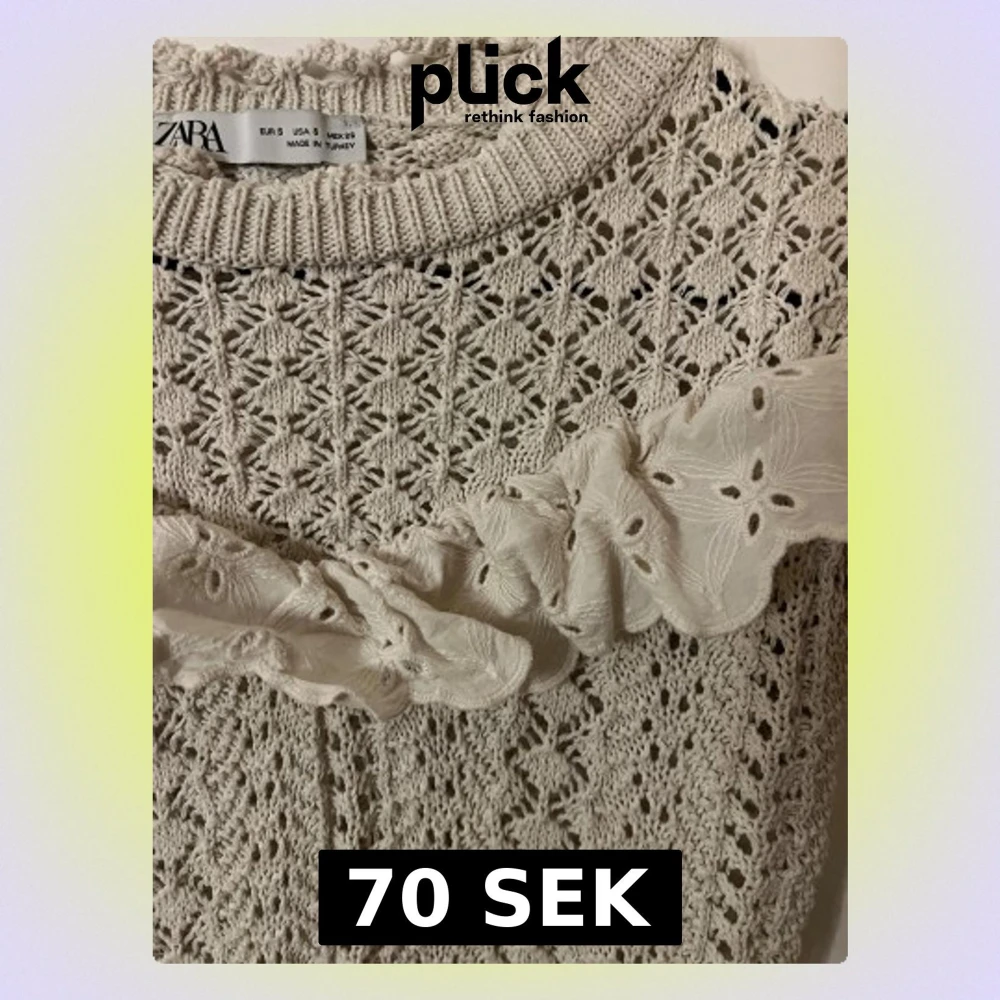Supersöt beige stickad topp från Zara med korta ärmar och rund hals. Toppen har ett detaljerat hålmönster och en bred volang med broderade blommor över bröstet. Perfekt för dig som gillar romantiska och unika plagg med mycket detaljer.