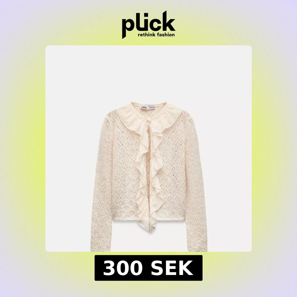 Supersöt beige stickad kofta från Zara med lång ärm och genomgående hålmönster. Koftan har volangdetaljer i chiffong längs krage och knappslå, samt en liten knapp framtill. Använd kanske 1 gång. Skriv för prisförslag, frågor eller bilder🩷