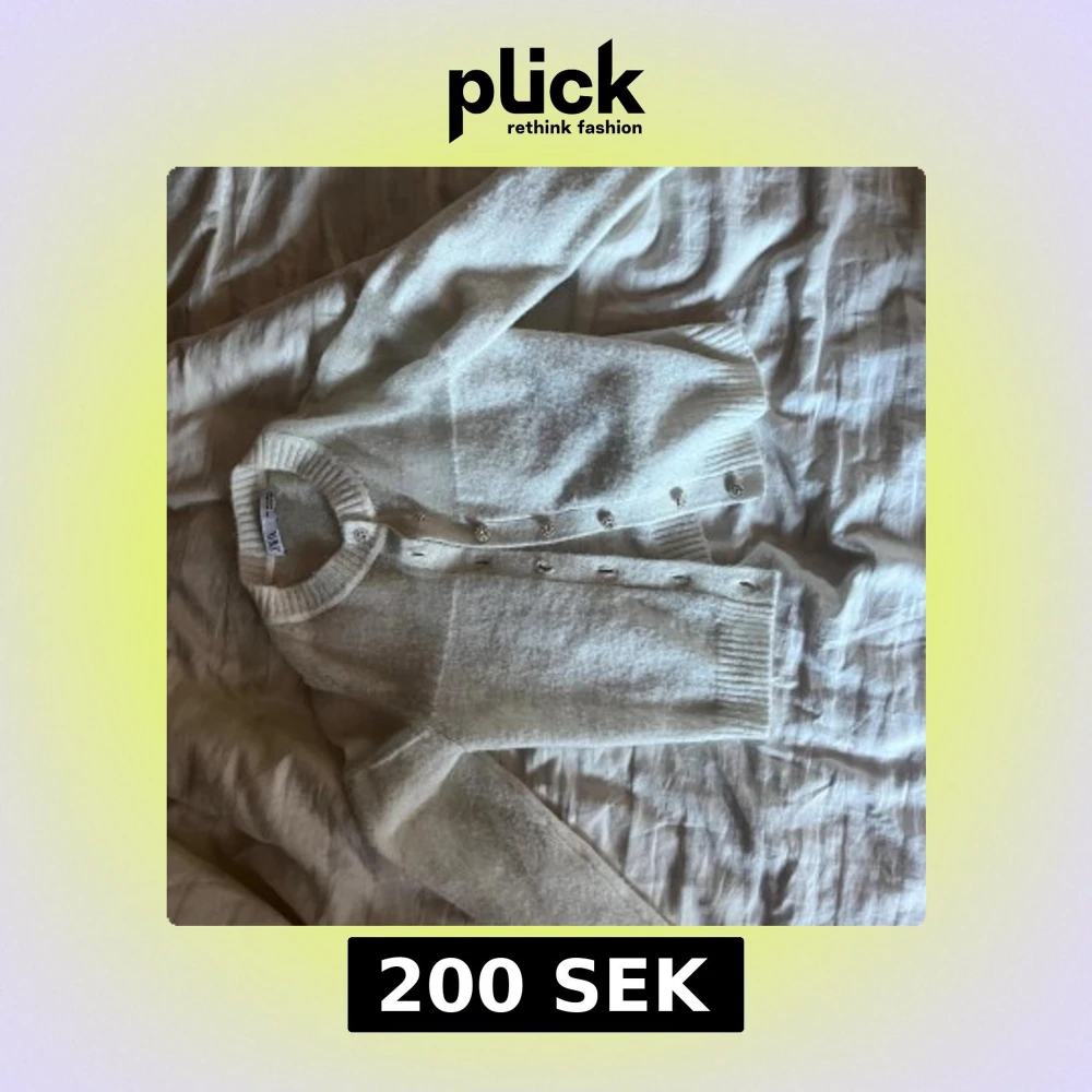 Superfin vit kofta från Zara med glittriga, pärlformade knappar. Koftan är stickad och har ribbade muddar vid ärmslut och hals. Perfekt för lager-på-lager och ger en clean look till din outfit.