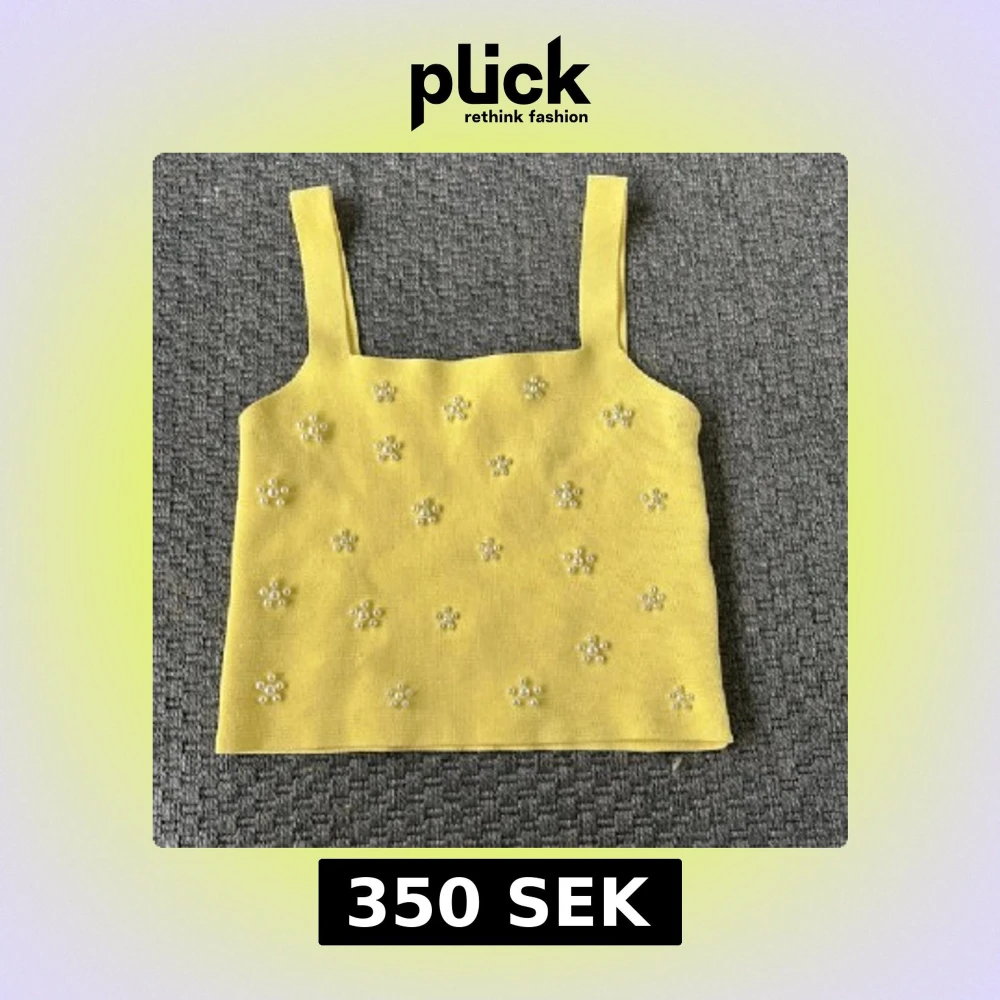 Superfin gul linnetopp från Zara med breda axelband och dekorerad med små pärlor i blommönster över hela toppen. Perfekt för att liva upp din outfit med en färgklick och söta detaljer. Toppens material känns mjukt och har en lätt stickad känsla.