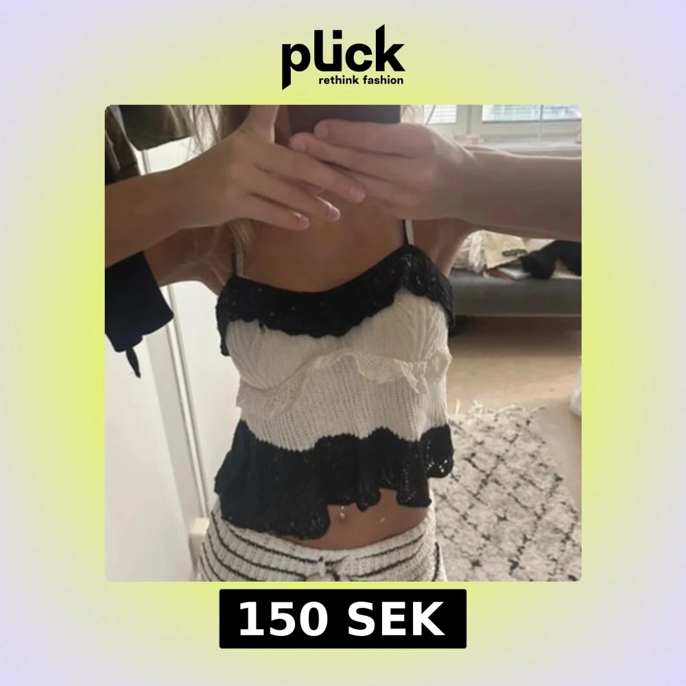 Säljer en söt stickad linnetopp i svart och vitt med volangdetaljer. Toppen är croppad och har tunna axelband, perfekt för dig som gillar en trendig och lekfull stil. Materialet är mjukt och luftigt, och volangerna ger en extra touch till looken.
