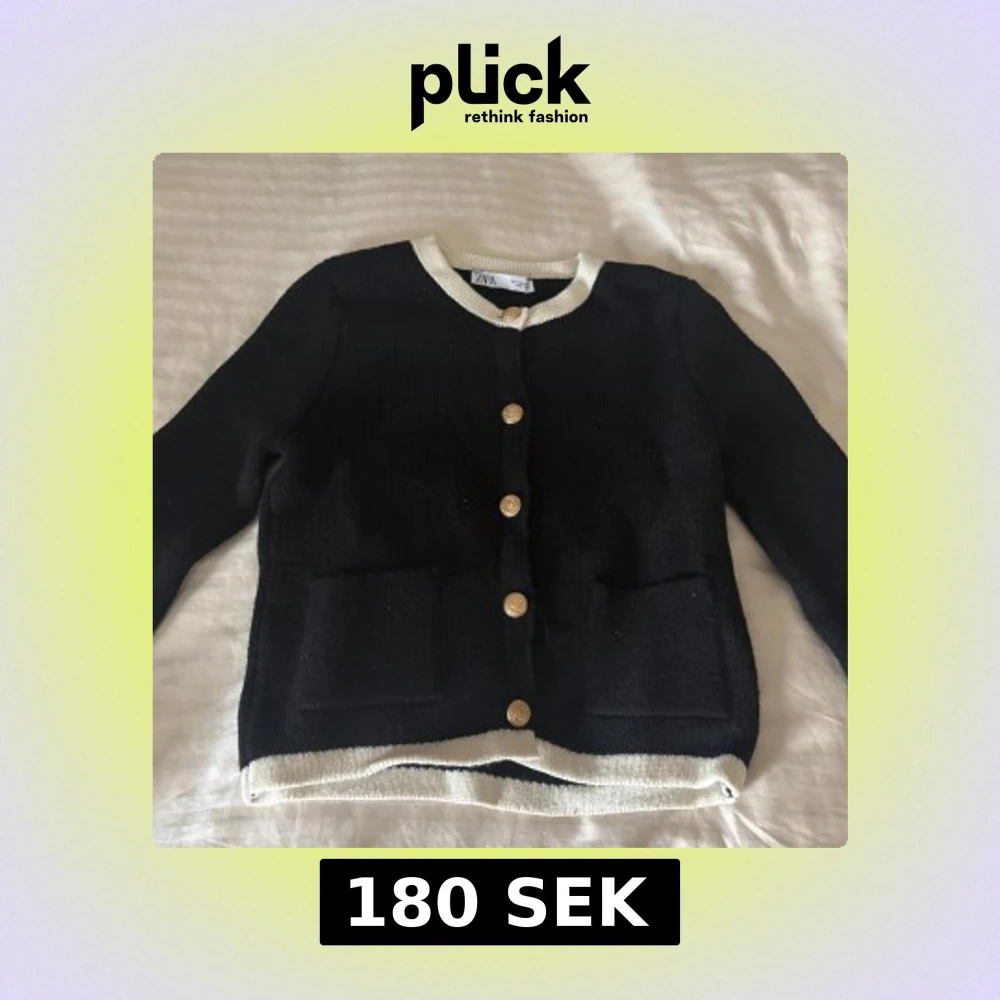 Svart kofta från Zara med kontrasterande vit kant vid hals och nederkant. Koftan har guldfärgade knappar framtill och två fickor. Stickad i mjukt material och har långärmad passform. Perfekt för att addera lite stil till din outfit.