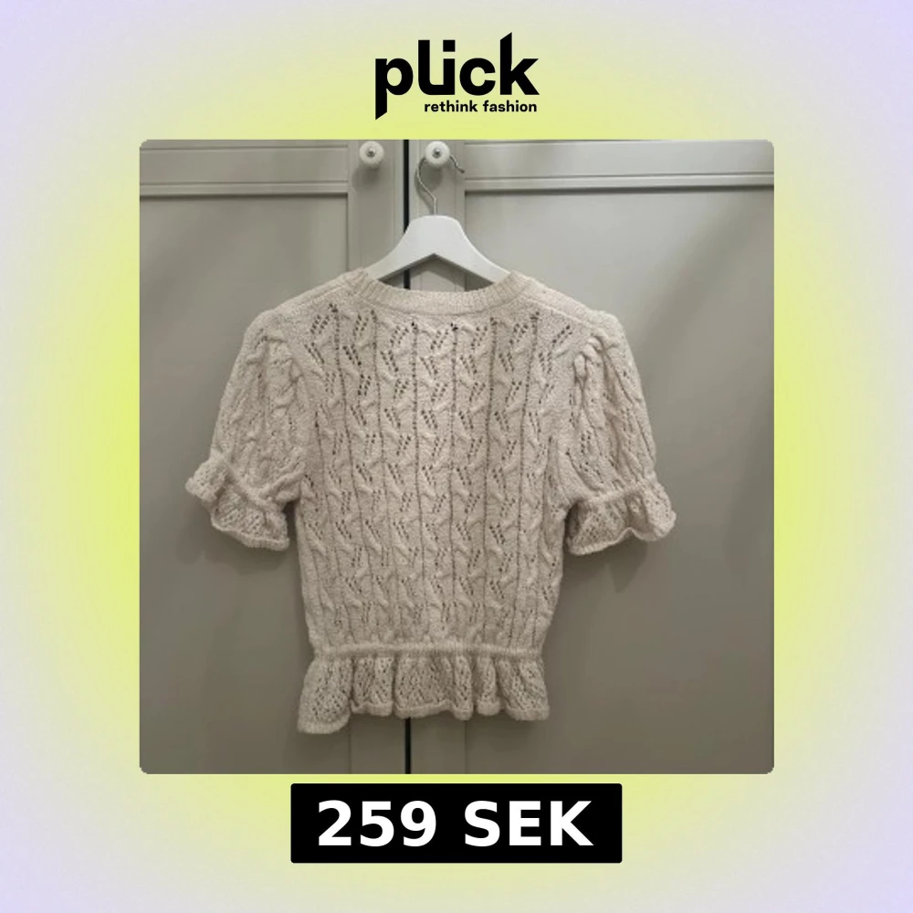 Säljer en söt vit stickad topp från Zara med korta ärmar och volangdetaljer vid ärmslut och nederkant.
