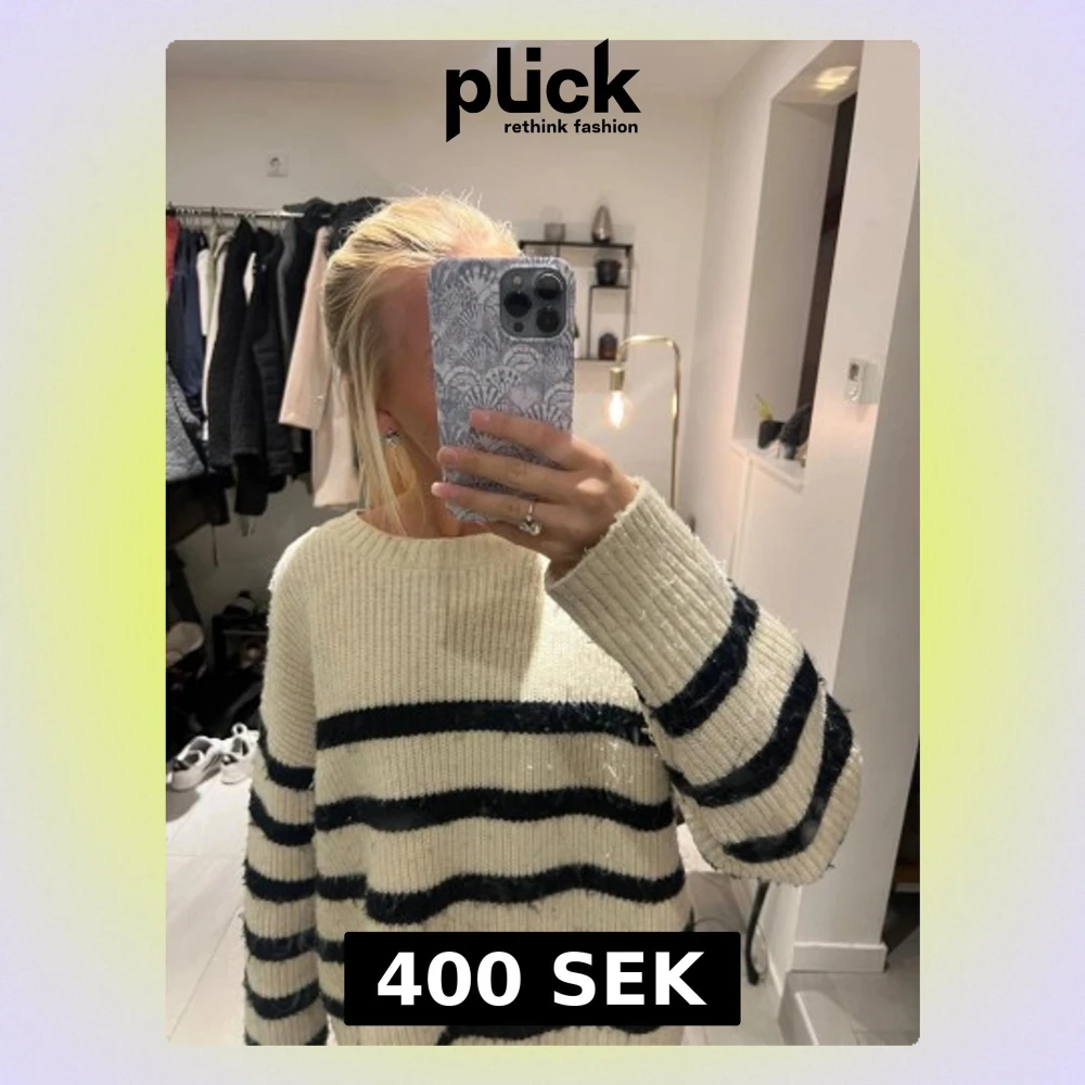 Mysig stickad tröja i offwhite med breda svarta horisontella ränder. Tröjan har en rund halsringning och långa ärmar med loose passform. Ribbstickad struktur som ger en chill och avslappnad vibe, perfekt för lager på lager under kyliga dagar. Går nt att köpa längre!!!