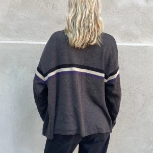 Grå stickad tröja med vita detaljer - Mysig grå stickad tröja med rund hals och vita ränder längs ärmarna samt vid ärmsluten. Perfekt för lager-på-lager och chill dagar. Tröjan har en relaxed fit och långa ärmar.
