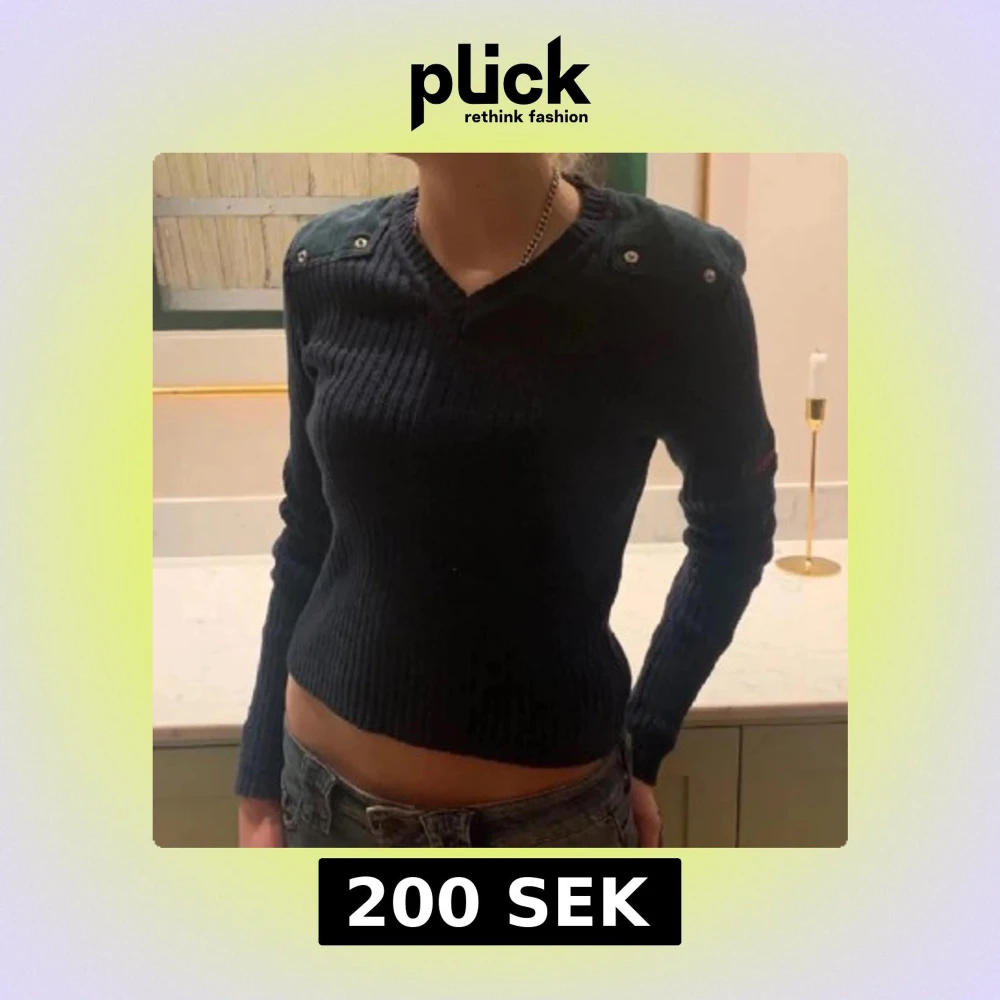Snygg mörkblå ribbad tröja med v-ringning och dekorativa knappar på axlarna. Tröjan har långa ärmar och en croppad passform som ger en modern look.