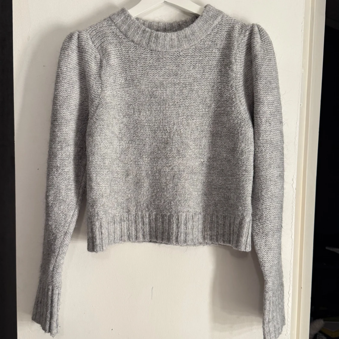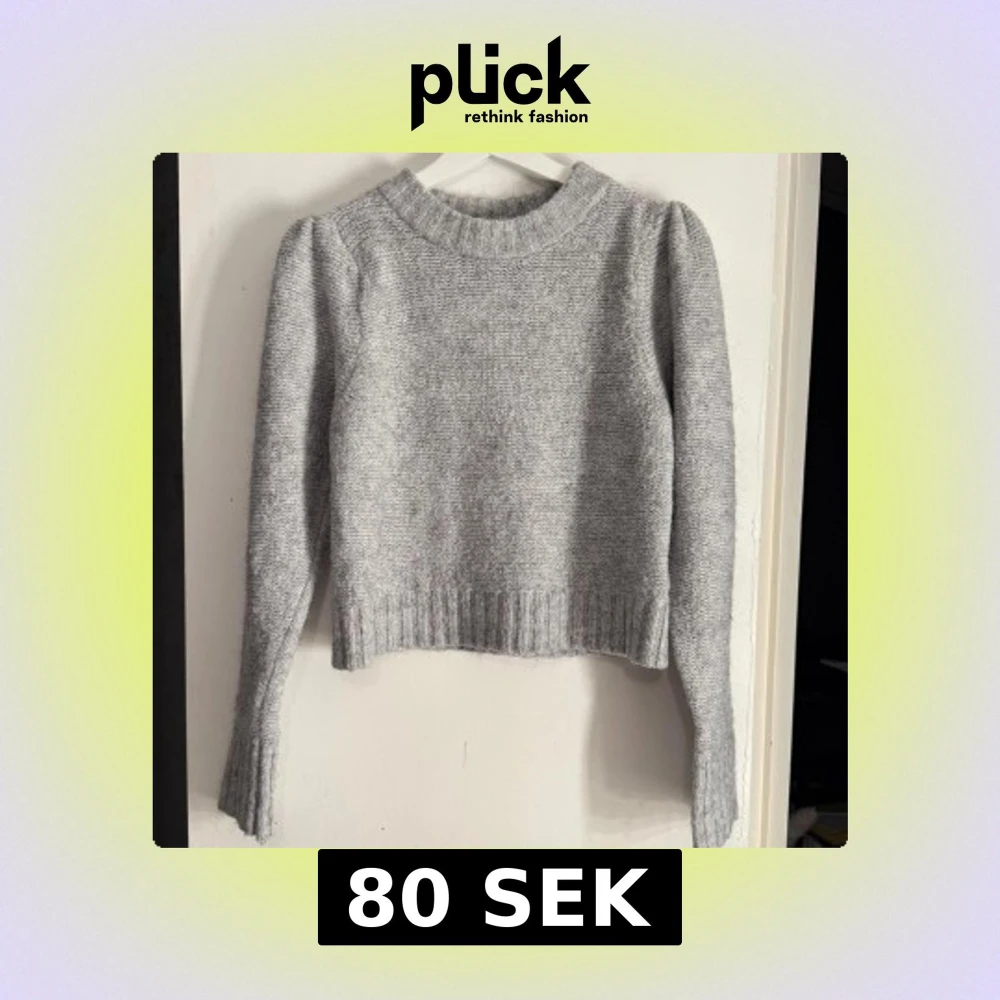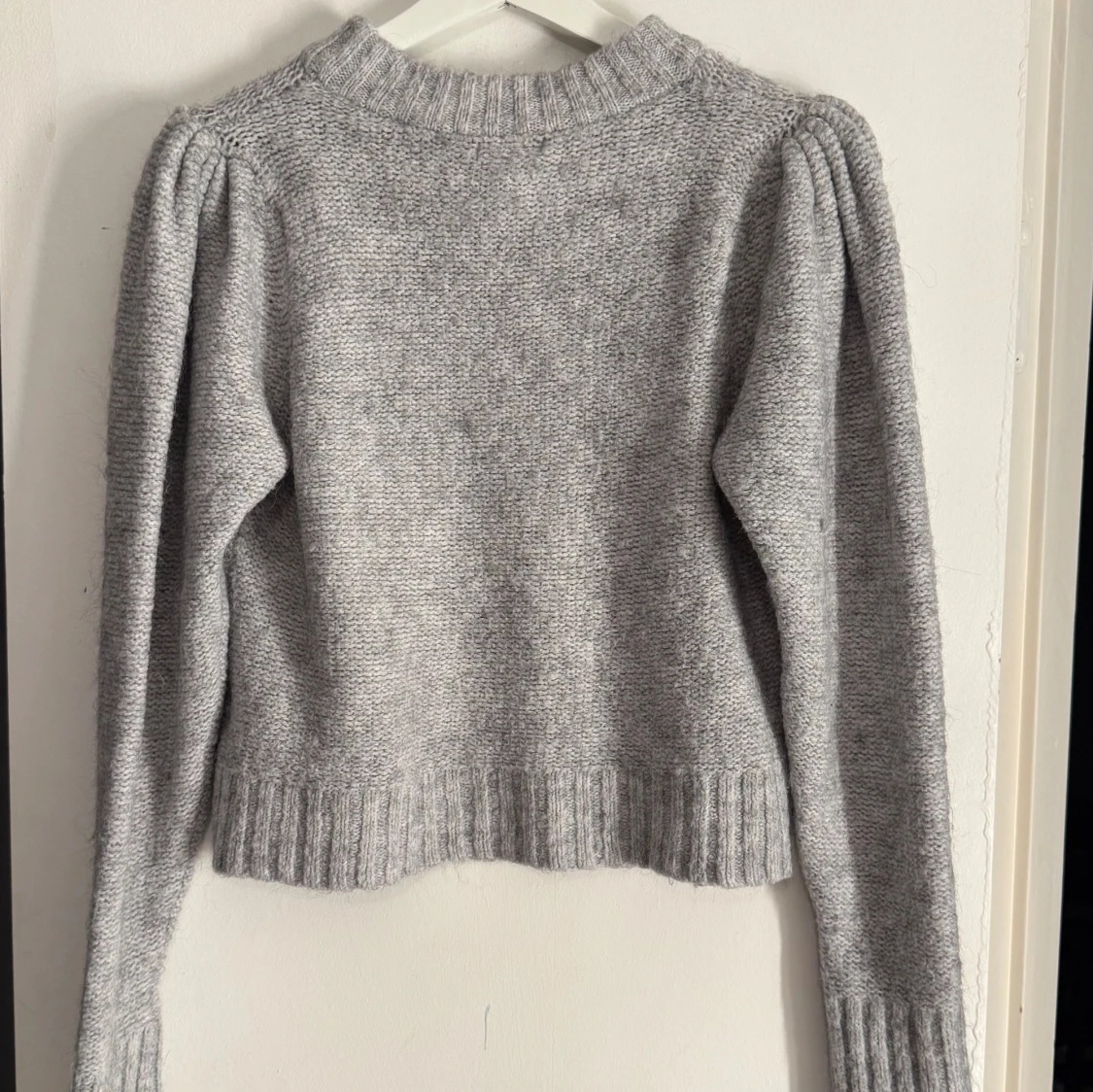 Mysig grå stickad tröja med långa ärmar och ribbade detaljer vid hals, ärmslut och nederkant. Perfekt för kyliga dagar.