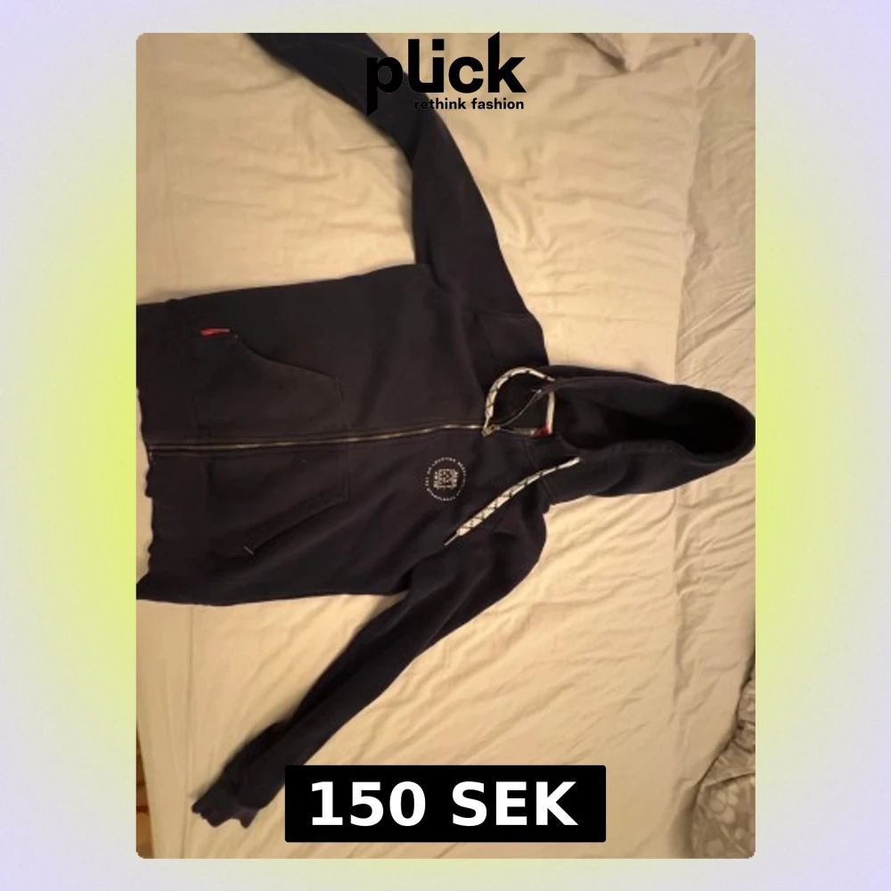 Snygg mörkblå hoodie från Race Marine med dragkedja och huva. Tröjan har vita och svarta snören, två fickor fram och ett litet tryck på bröstet. Perfekt för chill dagar och sportiga outfits.