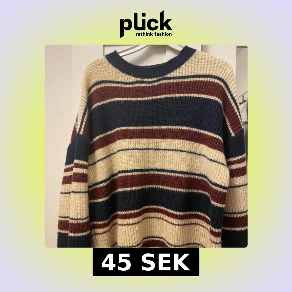 Säljer en oversized stickad tröja med breda ränder i marinblått, vinrött och beige. Kan samfrakta vid köp av två eller mer produkter.
