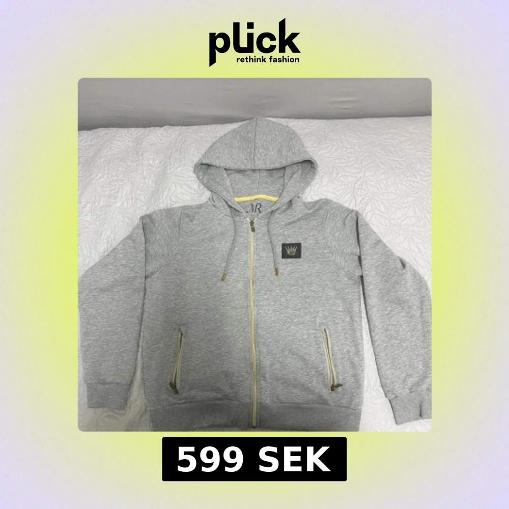 Snygg grå hoodie från M.R med gulddetaljer på dragkedjor och snören. Tröjan har huva, två fickor med dragkedja och en svart patch med krona på bröstet. Perfekt för chill dagar och streetstyle.. väldigt bekväm tröja och ganska sällsynt att se denna koftan utomhus.